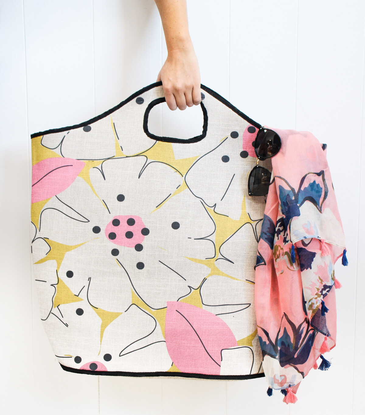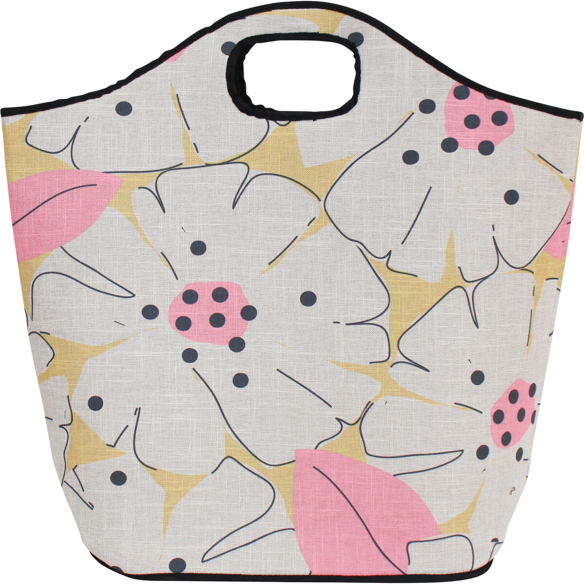 Our Beach Bag Summer really does make a statement. It’s a practical 64 x 60 x 22cm - just the right size for a trip to the beach or even a picnic in the park, but what makes it so special is the design. Bright, happy florals and leaves in shades of blush pink, black, white, and yellow stand out against a background of taupe and beige. The blend of linen and foam neoprene is so lightweight and soft, but also holds its shape - we’re always amazed by how much it fits inside! Customers won’t have to worry about this bag losing its structure or not being able to support heavier things. Plus, with its circular handle and sloping sides, it doesn’t just look beautiful when being carried, but also makes a sweet storage piece at home when not in use. So it’s both handy and good-looking - you know how hard that can be to find!