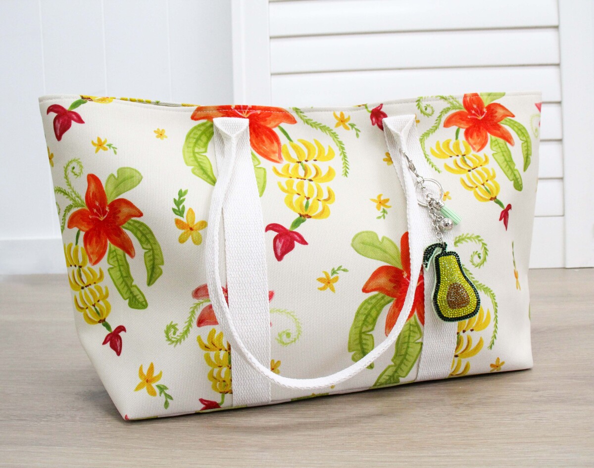 We keep seeing these vibrant and playful tropical colours selling well around this time of year and into spring because the summers get so hot in Australia that everyone starts going to the beach. It measures 55x15x30cm plus handle and is made with cotton and polyester. It's quite light and airy as well, so it's not going to weigh anyone down.
