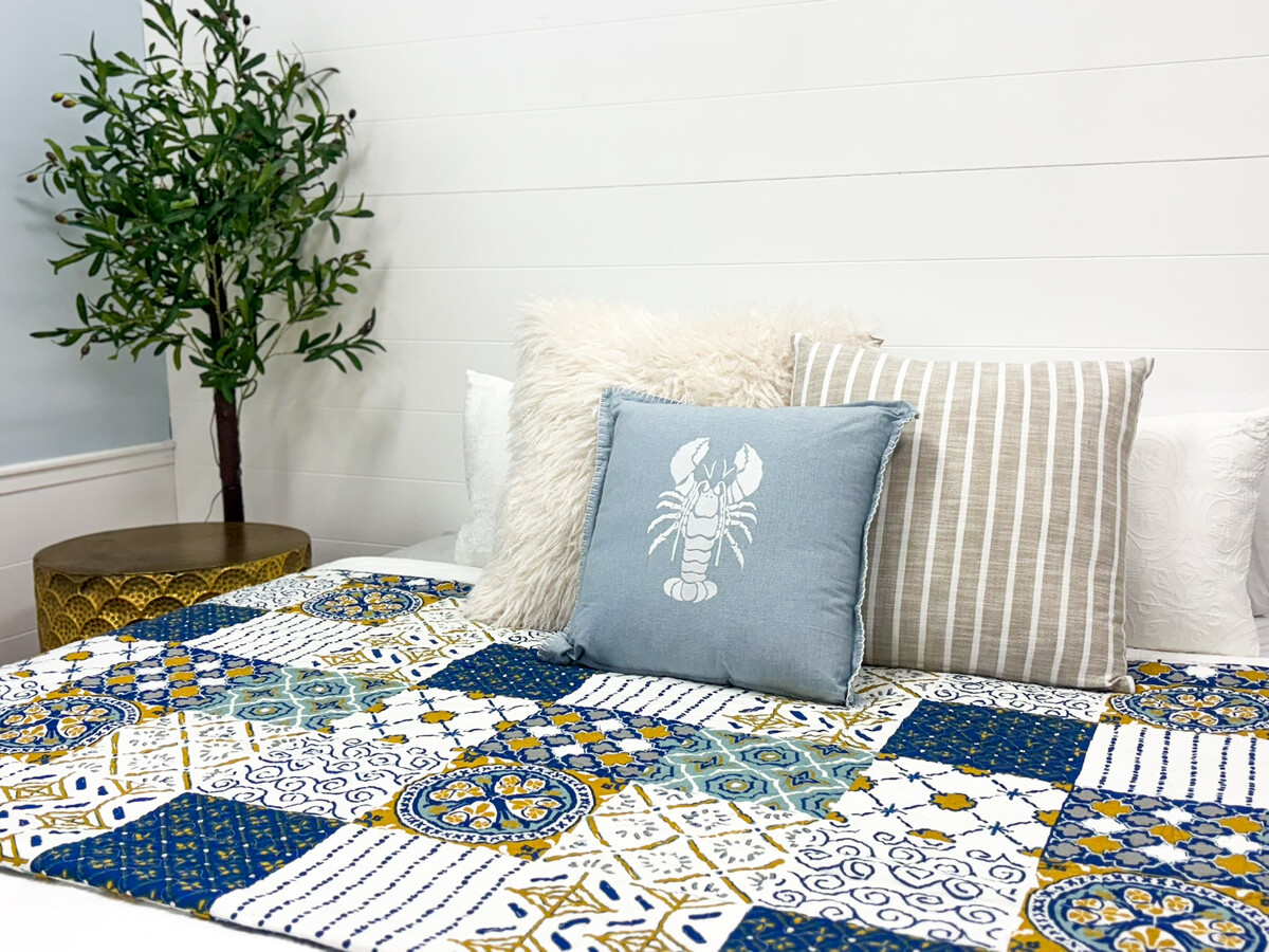 The Mediterranean Lrg Bedspread - it’s a piece that really surprises us every time. We keep coming back to it for its versatility and warmth. The colours, they have this perfect balance - crisp blue mixed with a bit of sunshine yellow and gentle, understated white. Not too bold, not too soft. It just works.