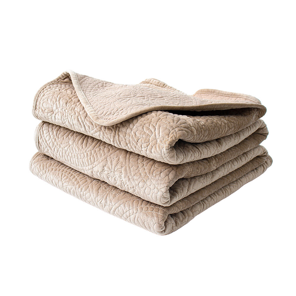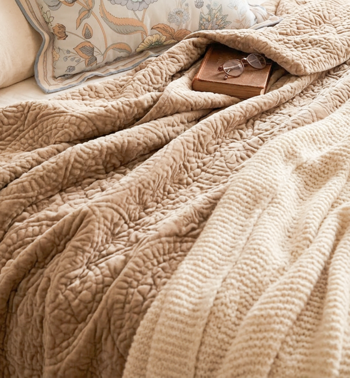 It’s that subtle sheen that grabs attention first – one of those finishes that catches the sunlight without ever feeling too much. This Velvet Beige Bedspread is just quietly beautiful, which can be tricky to get right in neutrals. We have gone big on neutral bedding this year and this beige colourway is a real favourite of ours. It’s practical but still manages to bring a soft touch to the room, which is probably down to the velvet front; it holds that quilted circular pattern so well.