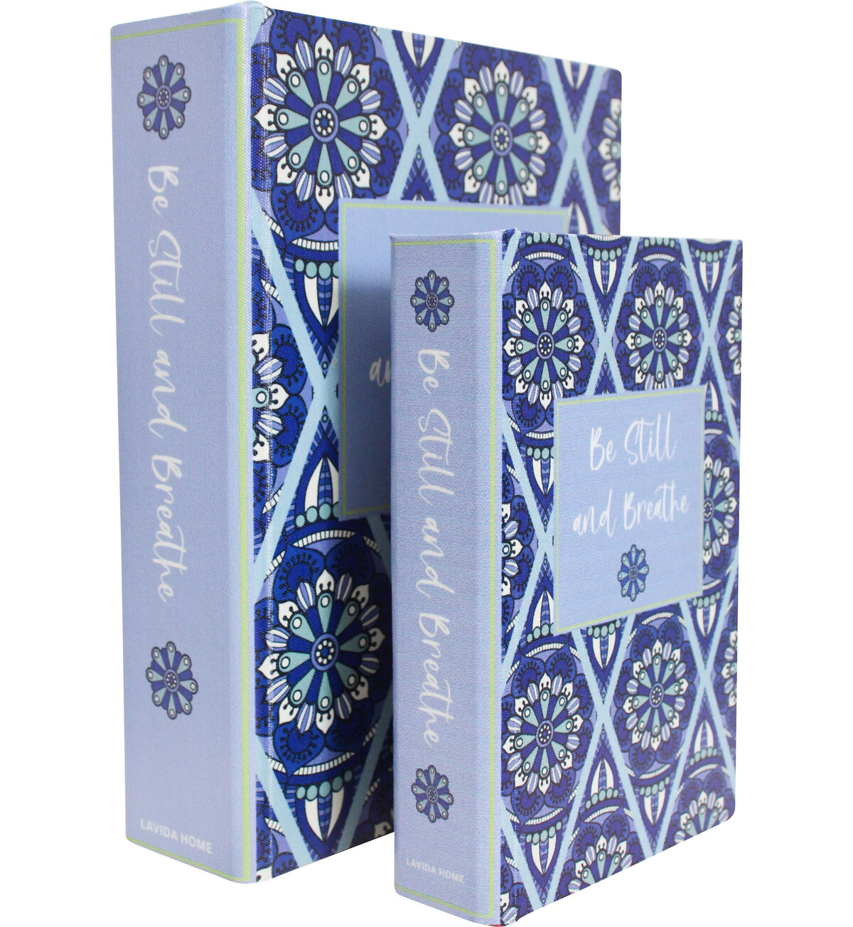 Right, we all know that people are looking for ways to weave a bit of mindfulness into their spaces - whether that’s at home or at work. Our Book Box S/2 Still and Breathe set does it with a beautiful balance of utility and style, which is something we love seeing in gifts and décor these days. Both boxes are built from sturdy MDF then wrapped in canvas and PVC for that extra protection against everyday wear. They look genuinely fantastic on display, too. The striking pattern in deep blues, offset with a simple centre panel saying ‘Be Still and Breathe’ just draws the eye. We’ve noticed the sizing (L: 24x18x6 / S: 18x12x4cm) really adds to their versatility - enough room for receipts, tea bags, or keys. Even those trickier bits of clutter that never seem to have a home. These have been designed to complement modern homes but wouldn’t feel out of place alongside boho elements or even minimalist pieces.