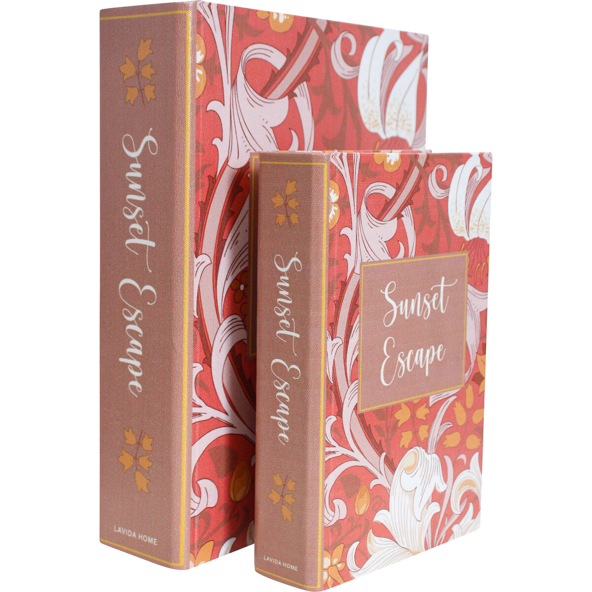 We really love this Sunset Escape book box set - it’s something that stands out on the shelf and gives customers a neat way to store their keepsakes, jewellery, or even office bits. We made these from sturdy MDF, then wrapped them in canvas and PVC, so they’re durable, light, and have that beautiful warmth and texture in the hand. And the two sizes (L: 24x18x6cm / S: 18x12x4cm) mean customers can stack them for extra storage or spread them around their home for a subtle pop of colour.