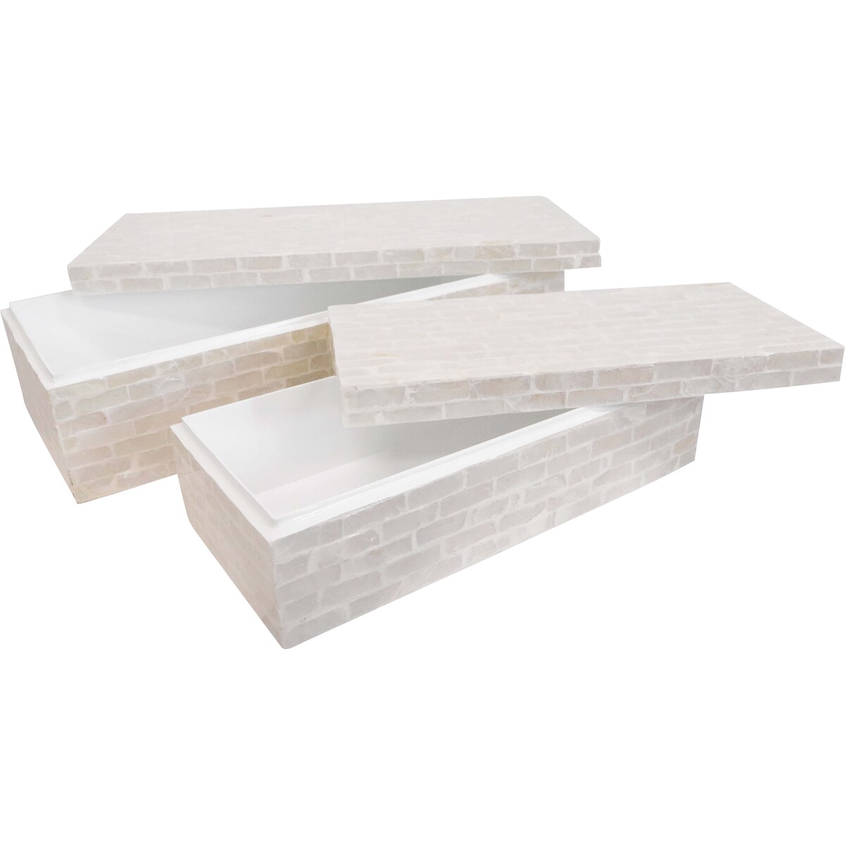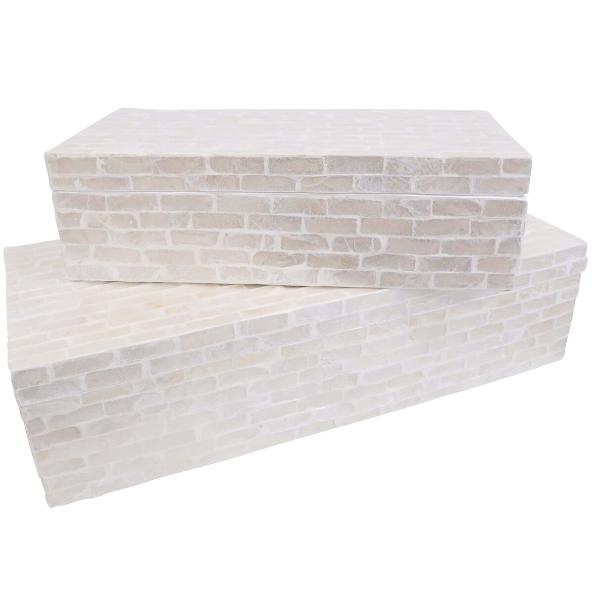 Our Box S/2 Matchstix Capiz is definitely not your everyday storage box set - the striking brick pattern and natural colour give these a genuinely unique look. What we really love is how organic these feel, since each one is handmade from capiz and mdf - that means no two are ever the same. They're understated, but catch the eye just enough to be interesting without looking like they try too hard. The set comes in two sizes, L: 36x16x9cm and M: 26x12x7.5cm, so they're practical for storage but also work as statement pieces on their own in the living room, office, or even on a hallway table. And thanks to their neutral finish, they blend with both modern and traditional settings. These are beautifully made, with all those quirky characteristics you only get when something’s crafted by hand using natural materials - the finish may vary between pieces, but that's what makes these genuinely special. We see these being a hit with customers who appreciate individuality and character in their homewares.