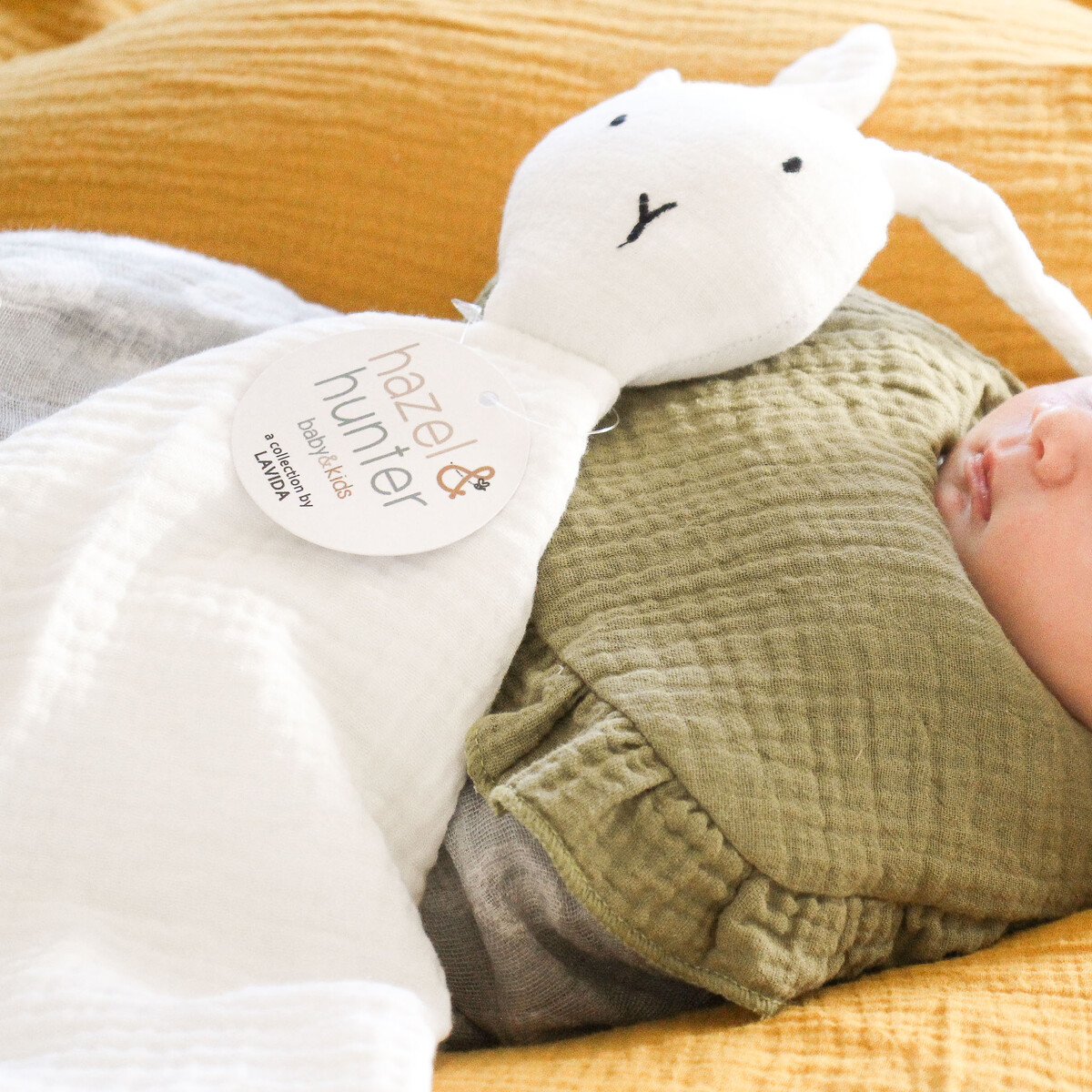 Now here’s something that will fly out of your shops. The Bunny Blankie in Pearl is the definition of a modern classic for any new baby collection - it’s a real crowd-pleaser with its simple, gentle design and soft handfeel that just fits the bill for a neutral nursery or cot display. This one comes in at 30x30cm (plus the cute animal head), which is a lovely size for little hands to grab on the go or to tuck into strollers and cots. And it’s properly considered, too, with 100% cotton muslin for that soft texture we all know babies adore. A little heads up - sizes are approximate only because each piece is handcut and finished so you’ll see some natural variation. After washing, it will get that super soft crinkled look but if customers want it flat, they can just stretch it gently whilst drying. The minimalist face is a winner for us - less distractions, more smiles from bub. And the knots on all four corners give extra points of interest as babies learn to grip and squeeze and teeth. Retailers who want to focus on responsible gifting love this piece too as it’s made from natural materials and safe dyes (EN71 Certified). Every new mum wants at least one comforter in their gifting selection - this brings in conscious design as well as easy-to-merch simple styling that mixes with other brands if needed. Pearl white colour suits any gender, plus adds an extra splash of sophistication to a usually cutesy style. We know how important it is to have items that suit multiple styles and this is one of our bestselling modern scandi gifts for newborns - it's perfect for any baby shop!