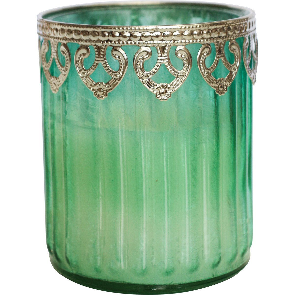 Candle Barly Lagoon - 10x10x11.5cm This one always gets people talking - the Candle Barly Lagoon brings a fresh, slightly regal, touch to any decor. We love the green finish with its textured detail. But what really catches the eye is the delicate metal lacework in gold around the rim. It’s pretty without being overly feminine and sophisticated yet feels welcoming. This unique piece (10x10x11.5 cm) feels substantial enough to stand alone on a coffee table or desk but is just as lovely grouped with candles of similar height for a layered look. They’re crafted from glass, wax, and a touch of metal for that extra elegance. We think your homewares customers will love it, but so will retailers who stock wedding or event products - it feels like something you’d find at an upmarket wedding or luxury event! The soft blue-green glass is perfectly dreamy on its own but it really gets a bit romantic when you light it at night.