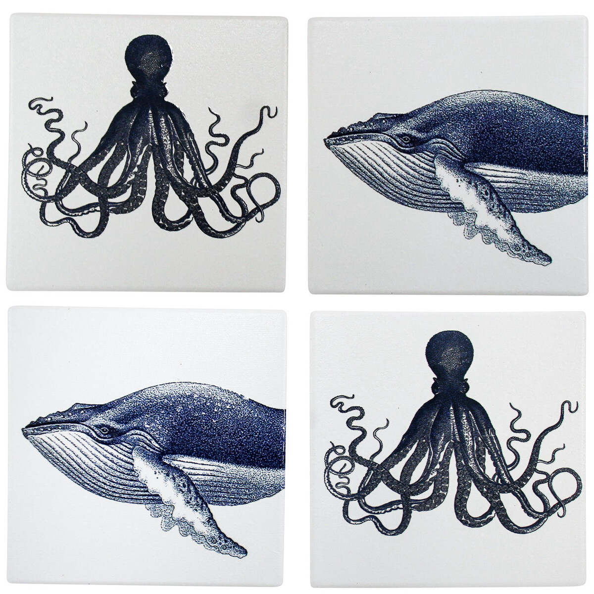 These are some of our favourites for bringing a bit of coastal style to the table - our Octo Whale Coaster Set features a mix of classic ocean-inspired designs, perfect for making a bold statement with those familiar navy and white tones. They're made from sturdy ceramic and measure 9.5 x 9.5cm, which makes them a great option for gifting or for shop owners wanting to create that nautical look in their store displays. We find they really appeal to customers looking for something that's both practical and stylish, especially when paired with other pieces from our homewares collection.
