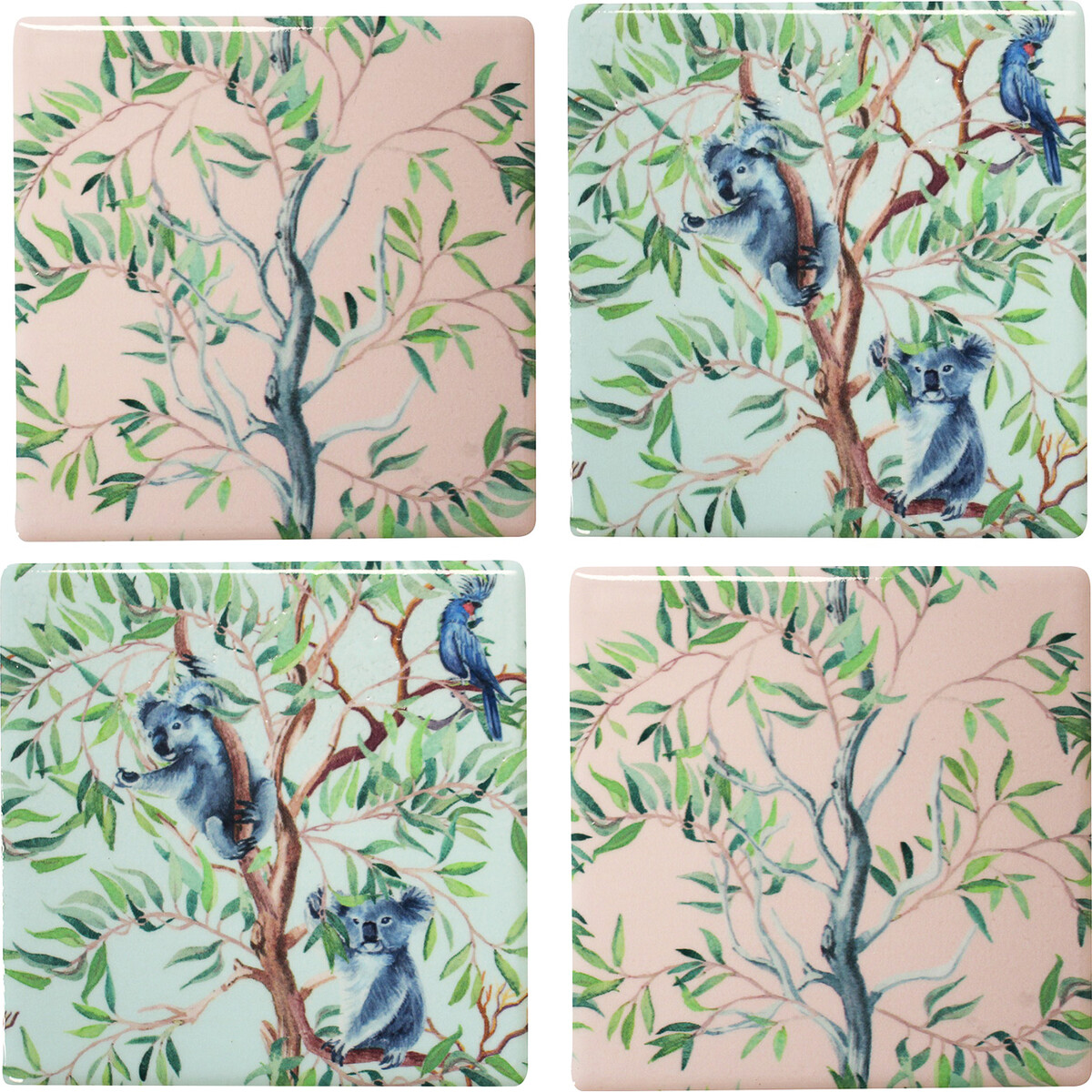 So here’s one that’s really got us all talking - the Coasters S/4 Eucalyptus Living. We’re a little bit obsessed with this design - honestly, we find ourselves just staring at it on the shelf some days. The set brings a little slice of eucalyptus charm straight into any home, whether they’re put out for that first coffee of the day or set down on a conference table in an office for meetings. The soft pink and green hues are refreshing but not overpowering, and those Aussie icons (the koalas) - they just work so perfectly.