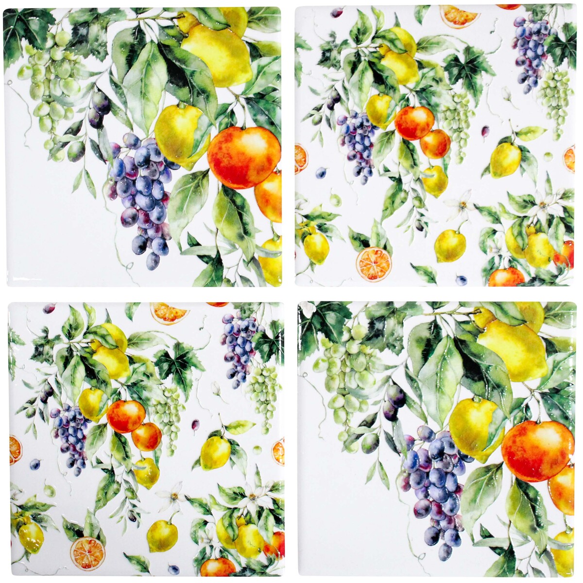 If you’ve been searching for something that makes a kitchen or living space feel just a little more like the Mediterranean, we do think these coasters are perfect. With their bold, lively palette and exquisite grape and citrus pattern, they look absolutely stunning with plenty of fresh white accents and bring out the best in any stone or timber finishes. Now, about quality - they’re 10cm by 10cm and made from thick ceramic, so you can tell as soon as you pick them up that these are not cheap single-use party coasters. They do feel built to last, both for home or commercial use. All four come in the set so they make a brilliant gift for housewarmings or birthdays. We’re huge fans - classic Mediterranean oranges and grapes really never go out of style in Australia - and we find that people always say they look better in person than photos could possibly show.