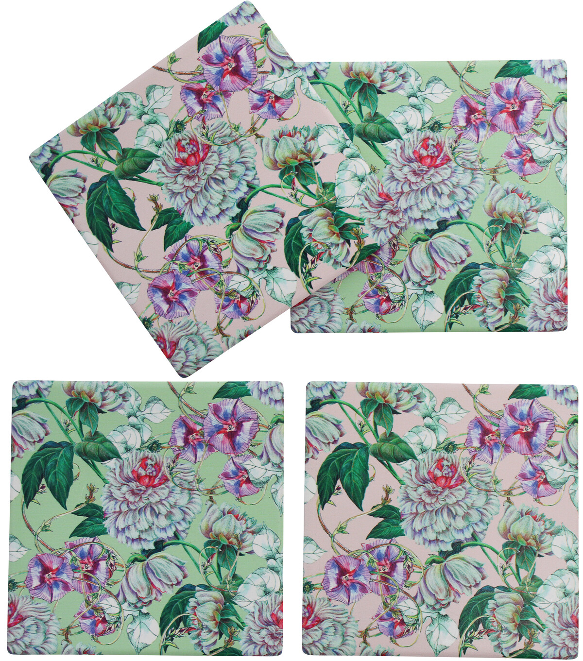 Their design is handcrafted porcelain with a pink and green base, decorated with stunning, colourful florals. Each piece is unique and individual because of their handcrafted make. They measure at 10 x 10 x 0.7cm and complement various home decor styles beautifully! If you’d like any more details on these (or if you want to view our entire coaster range), just let us know.