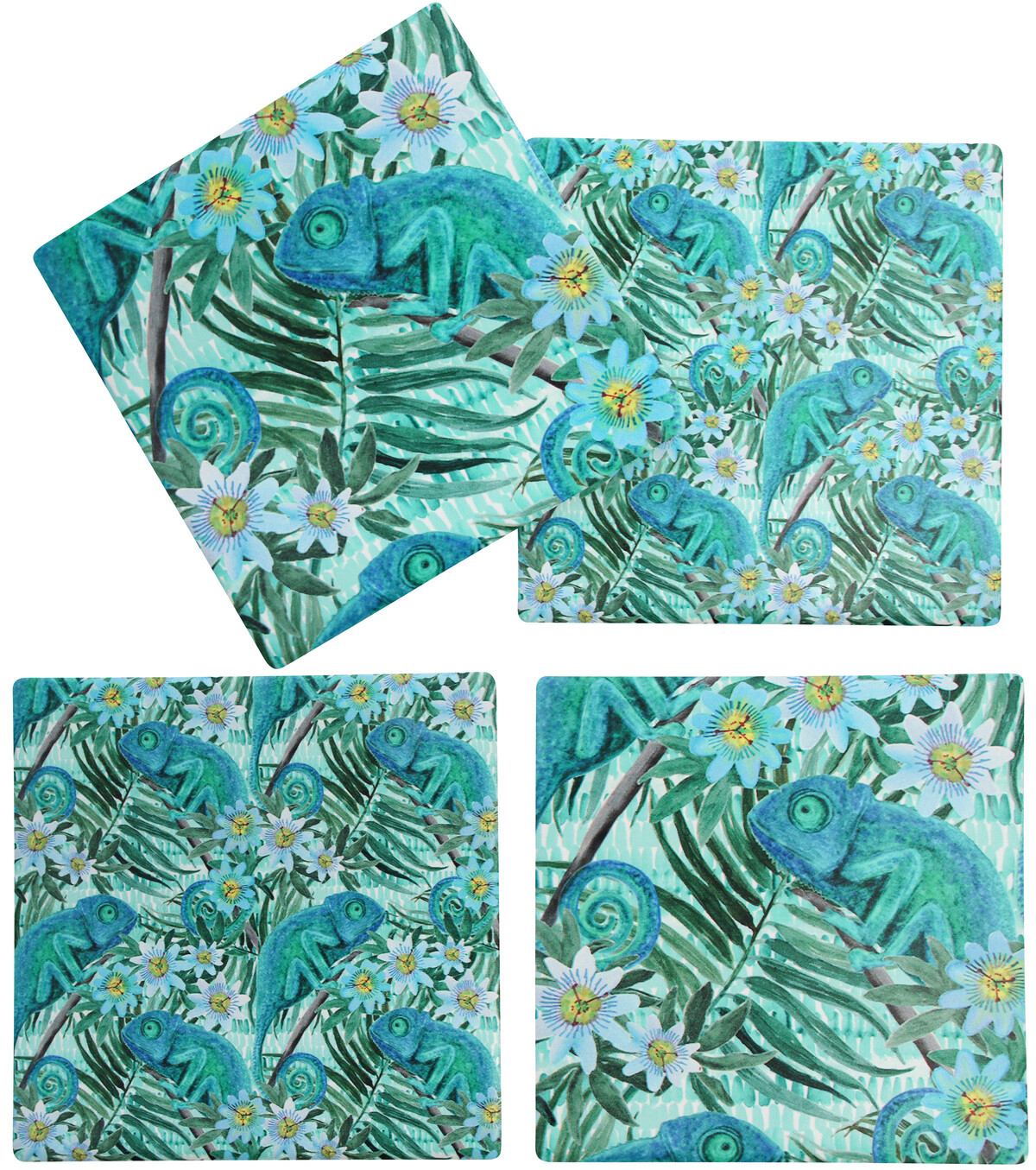 Our new set of Tropical Chameleon coasters is a real delight - with a whimsical print that grabs attention, but still manages to feel fresh and breezy at any table. This set of four features vibrant hand-drawn chameleons peeking out amongst jungle fronds and tropical blooms, all done in watercolour blues, greens, and summer whites. It’s a bit cheeky without being overly loud - just enough character to spark a smile and perhaps a conversation. The colours pair well with leafy plant pots, simple wood finishes, terrazzo bench tops, or that bold 80s revival trend we keep seeing everywhere. Each coaster is made from quality porcelain - glossy to the touch, easy to wipe clean, weighty enough to stay put even on glass tables. At 10x10x0.7cm they’re a good fit for most mugs and water glasses - no overhang, and just the right amount of surface area for those condensation rings to land on rather than wood or metal furniture below. Being handmade does mean you might spot some differences in decal placement from one coaster to another - but we think that’s part of the appeal. No two coasters will ever look exactly alike. We don’t consider these minor differences defects at all. Their individuality only adds to their charm and handmade authenticity. The style is hard not to love really, it looks great whether stacked neatly on a counter or fanned out at an afternoon tea with friends. And if your customers like tropical style with more personality than palm leaves alone? These are ideal - playful enough for kid-friendly spaces too, and durable enough for everyday use in the family home. This really is such a fun pick for shops wanting something different in their homewares offering - it’s creative without being over the top, classic yet trendy, and always practical underneath it all.