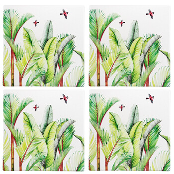 Tropical design coasters are a great little upsell for coastal or summer decor stores - especially around Christmas in Australia. These Coasters S/4 Tropics are a customer favourite for quality, look and feel. They're ceramic - a really decent weight in the hand - and the finish is really lovely. The palm design looks hand painted or brushed, and there are some vibrant green hues that really pop. Not too bright though - just enough to set off the white base and bring out those tropical bird details. These are 9.5 x 9.5cm across and come with cork backing so they're non-slip and safe for glass tables or outdoor settings. They work best as fresh summer decor, but we've seen them paired really well with darker wood furniture, woven rattan outdoor settings, retro glassware and earthy accent homewares too. Some customers have used them for table displays - to pop under small bowls or vases to protect surfaces (and add a bit of colour). Worth noting though, these coasters aren't presented as a 'gift' box and the packaging isn't claimable if damaged, so we'd recommend either displaying them individually or unpacking the sets for instore shoppers if it's worth it for your margins - because they do sell quickly each year in our experience!