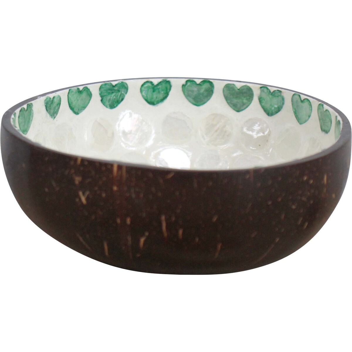 There’s something incredibly inviting about our Coconut Bowl Rabbit Green. We love how it instantly gives a relaxed, natural feel to any home or office, and the hand painted green hearts along the rim are a thoughtful touch that adds lovely personality. Each bowl is carved from coconut shell, so there will be slight variations in shape and size - this is part of the charm - but you can count on them being very close to 13 by 6 centimetres. They’re completely unique, with their own special colour, pattern, and character coming through in every piece.