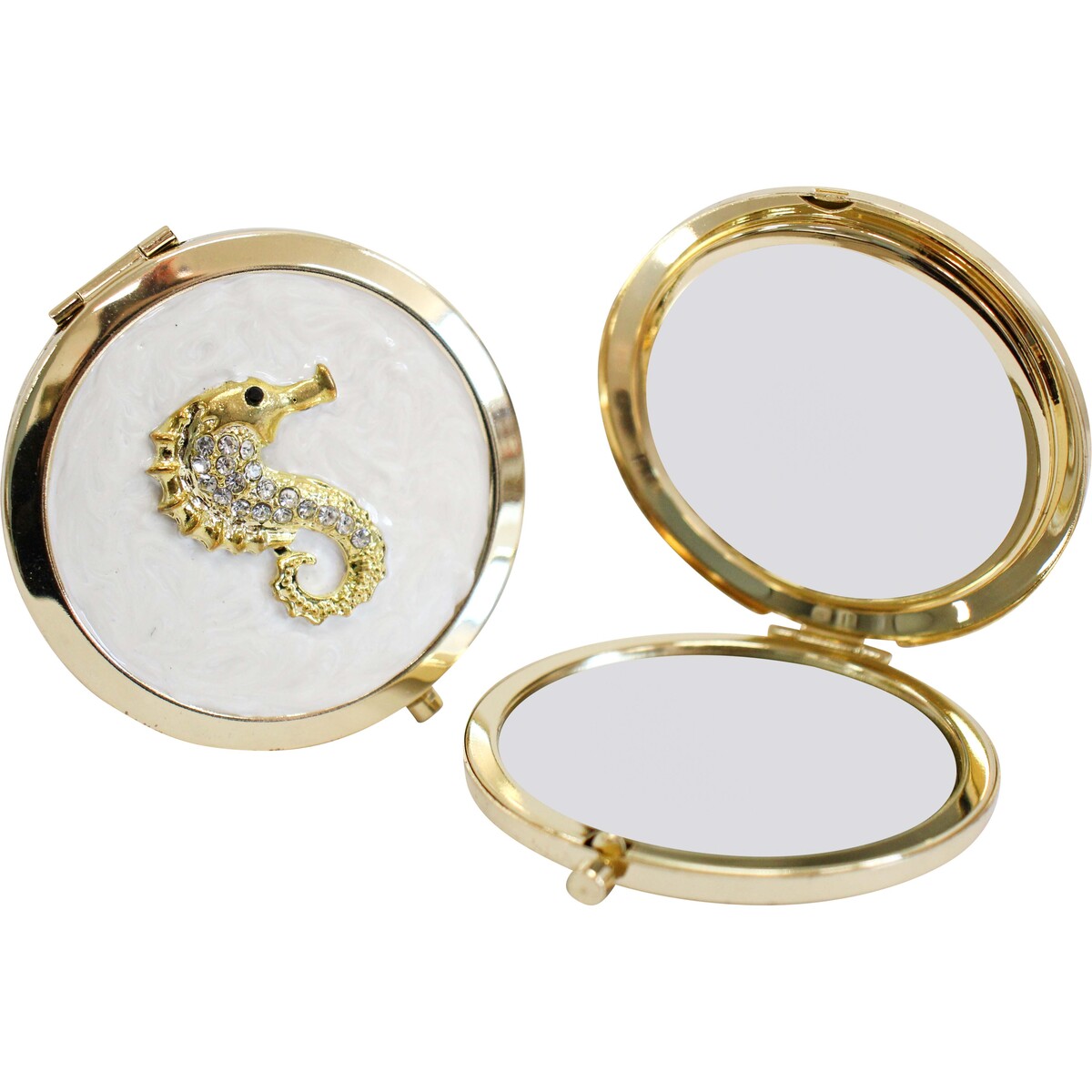 Let us tell you about a compact mirror that’s never going to be basic. These are the little home or on-the-go accessories people don’t expect to fall in love with, but they do. Ours is called the Compact Coconut Seahorse, and it takes every excuse away for boring packaging or tacky finishes - it’s dressed in gold and white enamel, set with a lovely seahorse and just enough sparkle for its size. The front features glass cabochon work, so you know it has a stunningly luxe feel in the hand. It flips open smoothly to reveal not one, but two mirrors inside its petite 7x7x2 cm round shell. Now, we haven’t classed our packing as “gift” boxed, so if any pieces are damaged in transit, claims won’t be accepted - but we do double check every shipment before it goes out. In our experience, this classic gold and white metallic finish fits almost any coastal or neutral colour aesthetic - it just works well in handbags as well as vanity counters or the odd hotel lobby ladies’ room tray. And we've seen these move well on shelves near reception counters and event pop-ups too.
