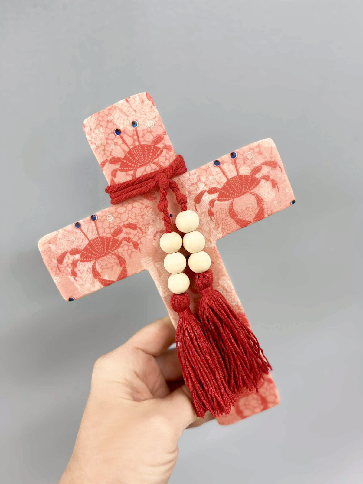The tassels hanging from the neck of the cross are extremely detailed and textured. The red stands out with the shade matching that of the crabs on the cross itself. The white beads break up the colourway tastefully, providing an eye-catching effect.
