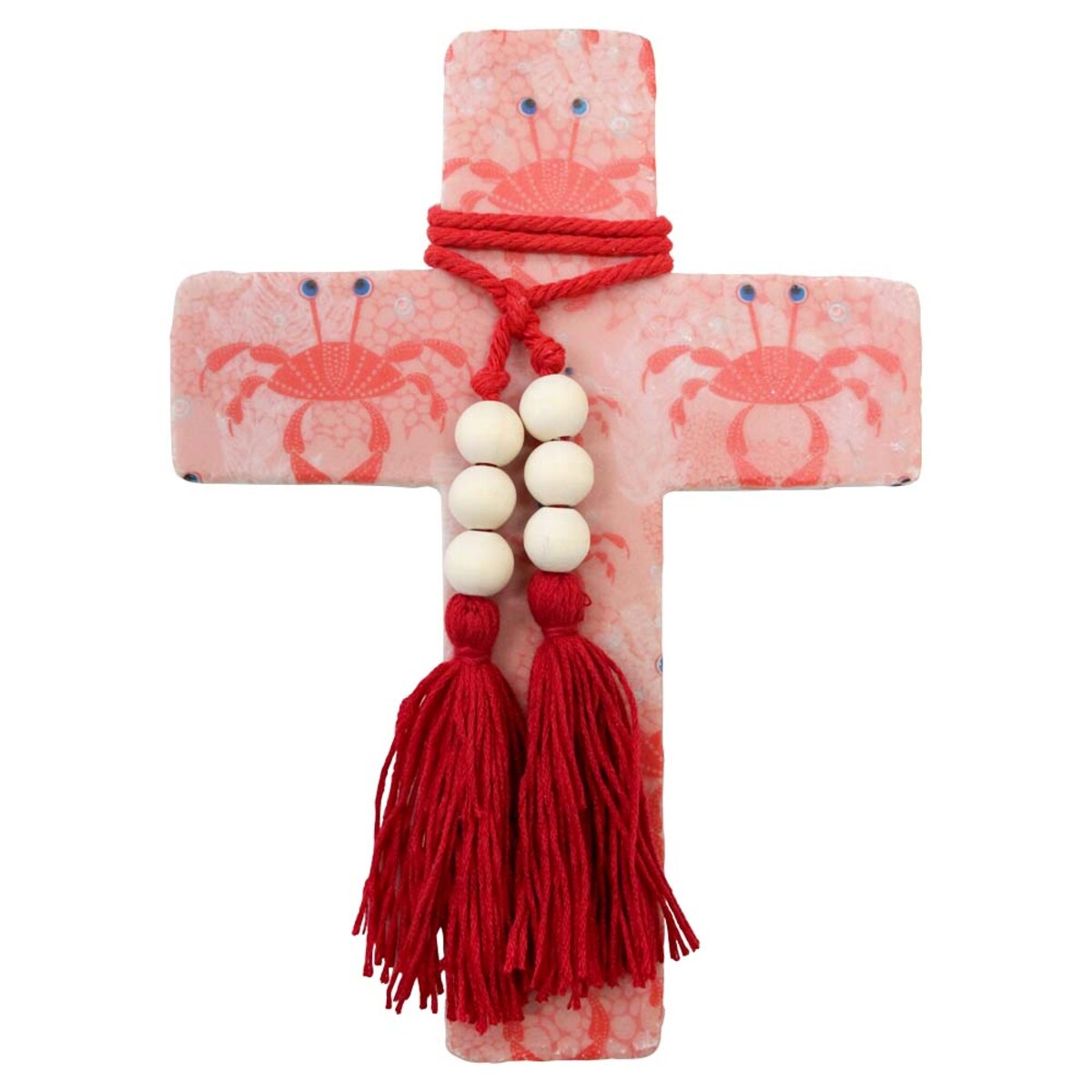 We love the fun Mediteranean look and feel of this piece. It's not often you see a cross that looks quite like this. The red crabs are quirky, yet distinctive and bold. It’s playful, but in a way that remains sophisticated. This is a piece for collectors of coastal, beach, or marine life style decor who are looking for something unique and light-hearted to add to their space.