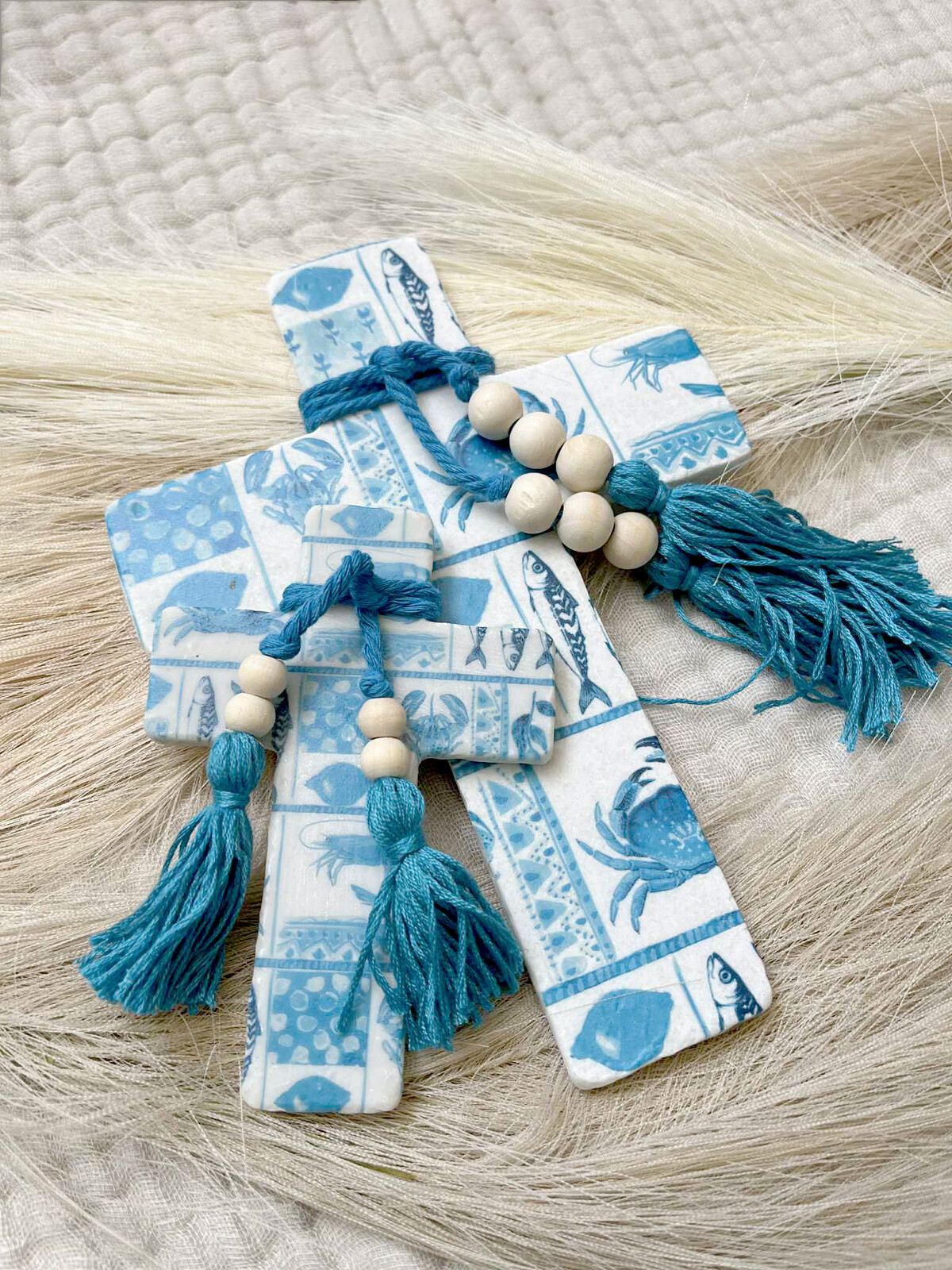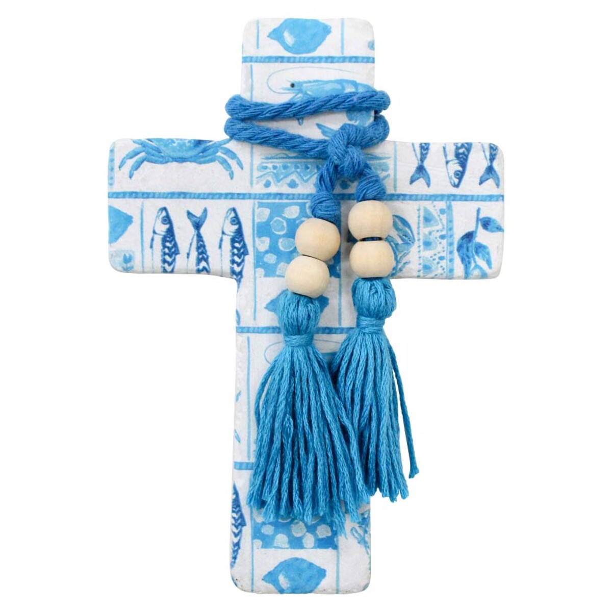 Our Cross Sml Ocean Postcard is a captivating piece of décor that easily makes a statement. It’s a blend of faith, oceanic serenity, and artisan style. Crafted from durable resin, this 9x13x19cm decorative cross is covered in delicate blue fish illustrations, reminiscent of vintage postcards and coastal escapism. That vivid blue palette really does make it pop - and those subtle fish motifs mean it will find fans with lovers of the beach, nautical themes, or just fresh colourwork.