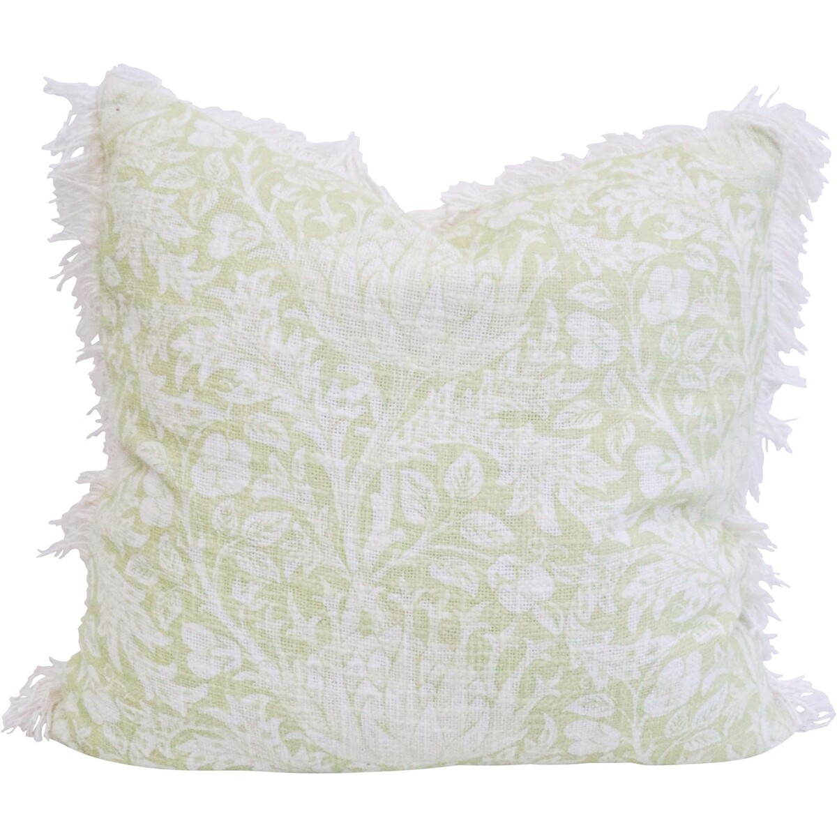 The subtle palette - nothing too dramatic - means it pairs comfortably with richer tones or stands alone against crisp white bedding or deep-hued sofas. This one always gets double-takes thanks to the sweet fringing details at the edge, plus that gentle artichoke motif that could almost pass for another type of flower depending on the angle you see it from.