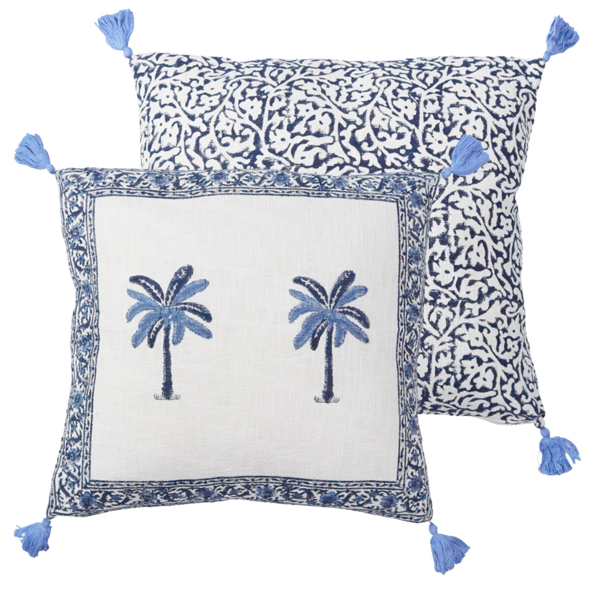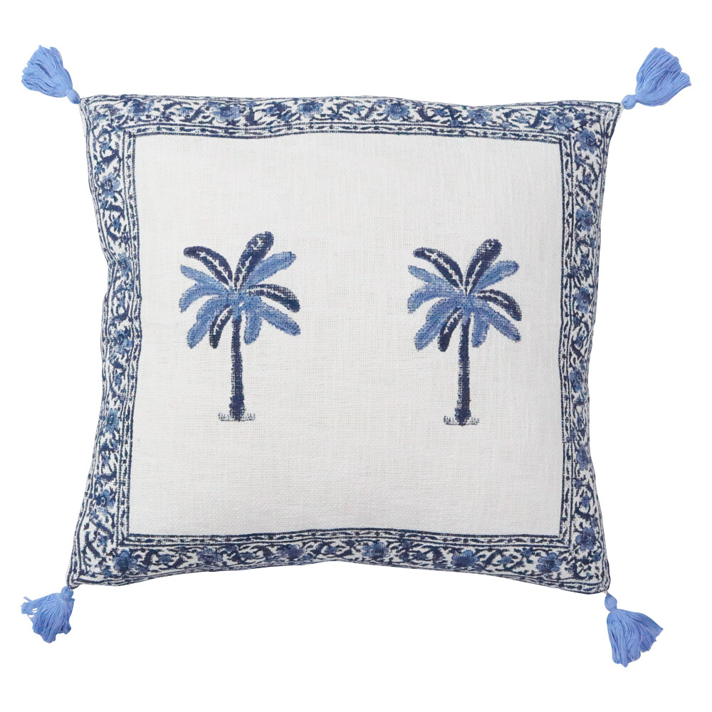 The soft, neutral hues combined with delicate blue palm tree motifs make this cushion an elegant addition that can seamlessly blend with various decor styles, from coastal chic to bohemian elegance. Its unique design and exceptional quality make it a standout choice for home or office decor, bringing a touch of serene sophistication to couches, armchairs, or entryway benches.
