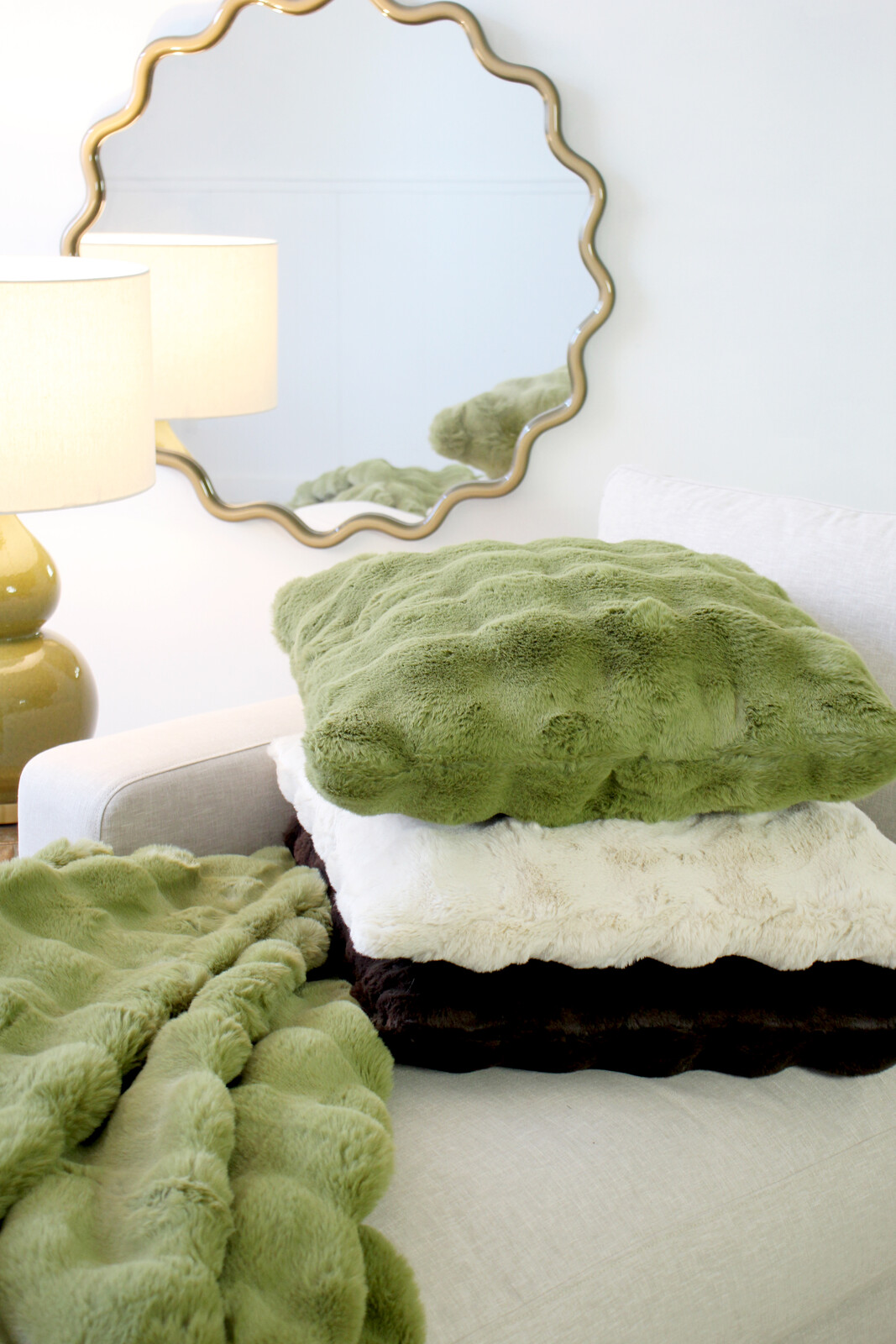 It’s rare to come across a cushion that’ll surprise you the way this Faux Fur Olive cushion does. Maybe it’s that plush, almost tactile surface - you just want to run your hand over it, right? It’s velvety but not too much, and we’ve found that’s one of the first things clients notice when they see it at trade shows, or when we show it to them in our showroom.