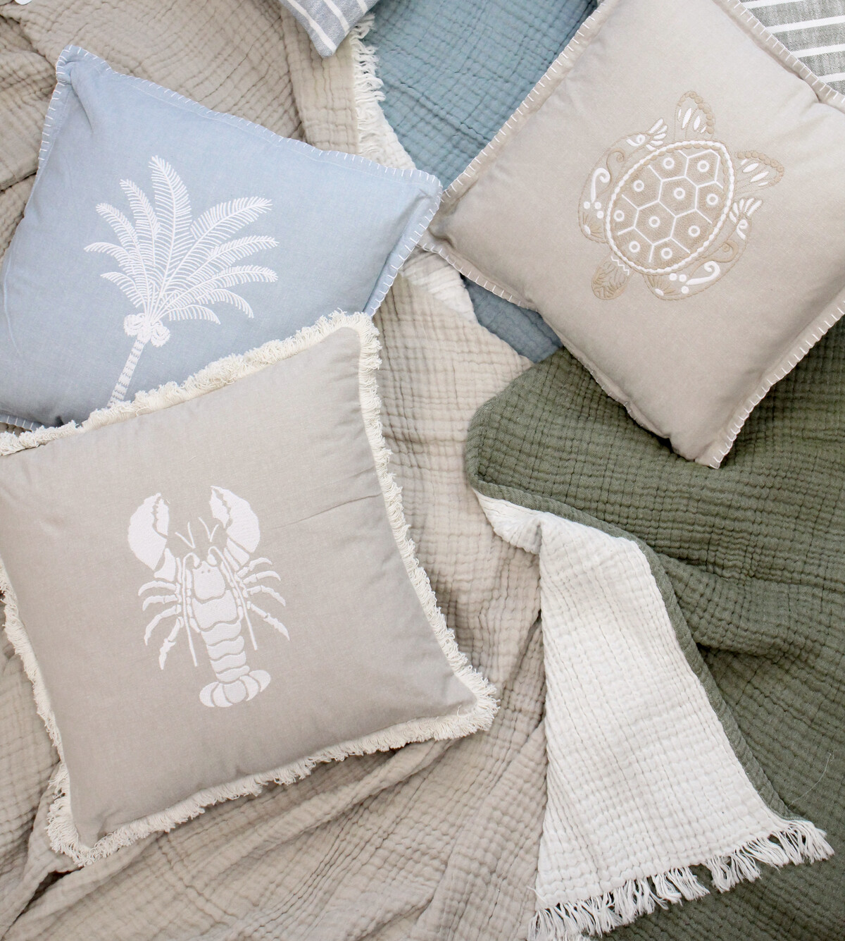 Our Cushion Turtle Natural Chambray is quite a stand-out piece. It just nails that relaxed coastal vibe but still keeps things stylish and easy to pair with other textures. The embroidered turtle design is a bit of a conversation starter - detailed, beautifully done, and subtle enough to keep the cushion from looking kitschy. A lot of us are loving how the motif manages to feel playful and fresh without being too on-the-nose, which we think is great for shops trying to tap into the new eco-trend.