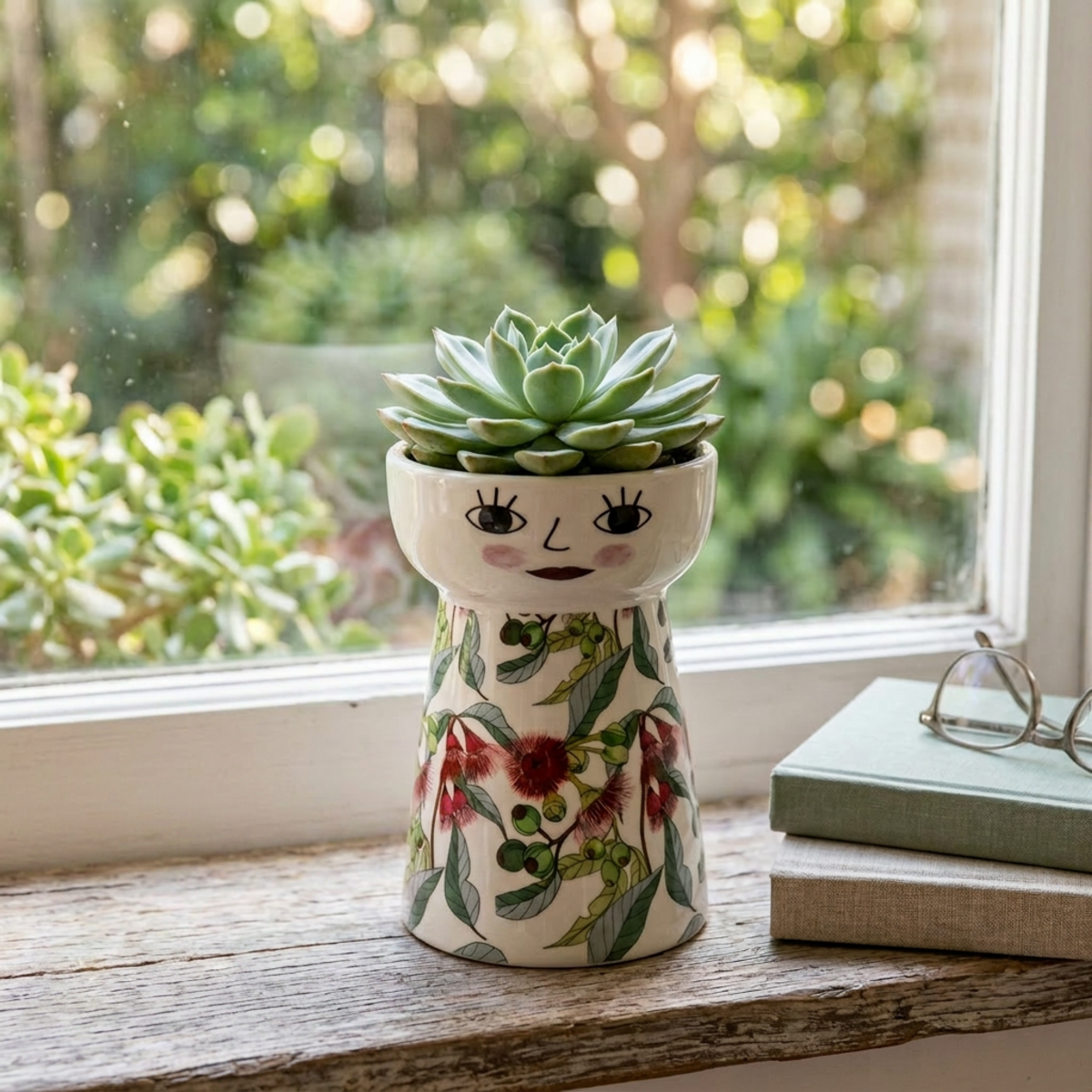 Our Doll Vase Gum Nut Flowers is a showstopper in the truest sense - the hand-painted cartoon face sits pretty on top of the ceramic body, which is covered in red and green gum nut flowers. With a smooth, high-gloss finish, this 11.5x11.5x16.1cm vase makes a whimsical but sophisticated addition to any shop display or product collection, especially as part of a larger tableware offering. And because it features an illustration of gum nut flowers, this piece is particularly well-suited for your customers who are looking for something that really celebrates our natural environment.