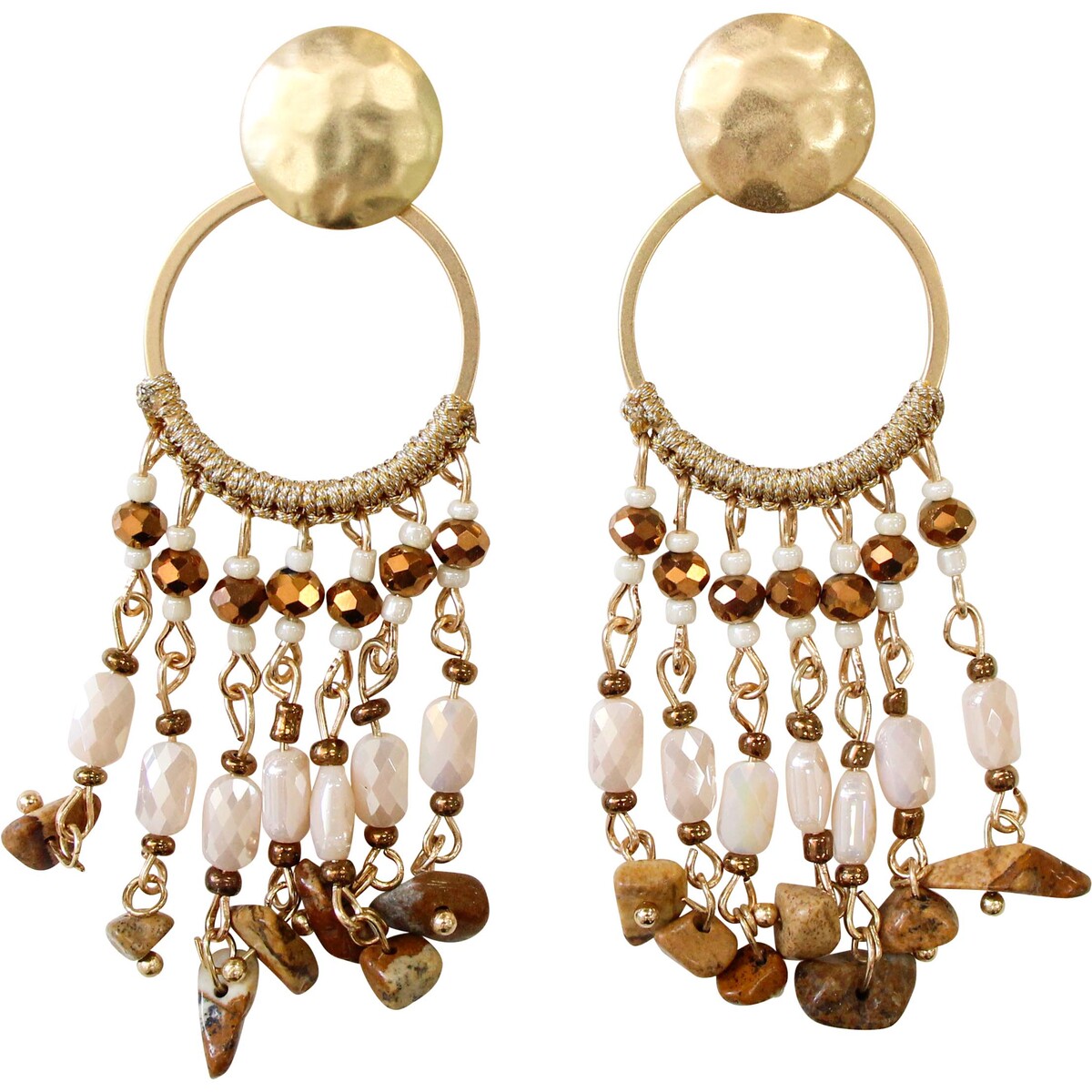 Earrings Adele are a stand-out piece and we don't say that lightly - they really are something else. Crafted with zinc alloy, glass, and stone beads, these earrings feature a stunning mix of browns and golds that catch the light in such a captivating way. The hammered gold detail at the top adds an elegant but earthy vibe, perfect for those customers who love unique, statement jewellery with a natural feel.