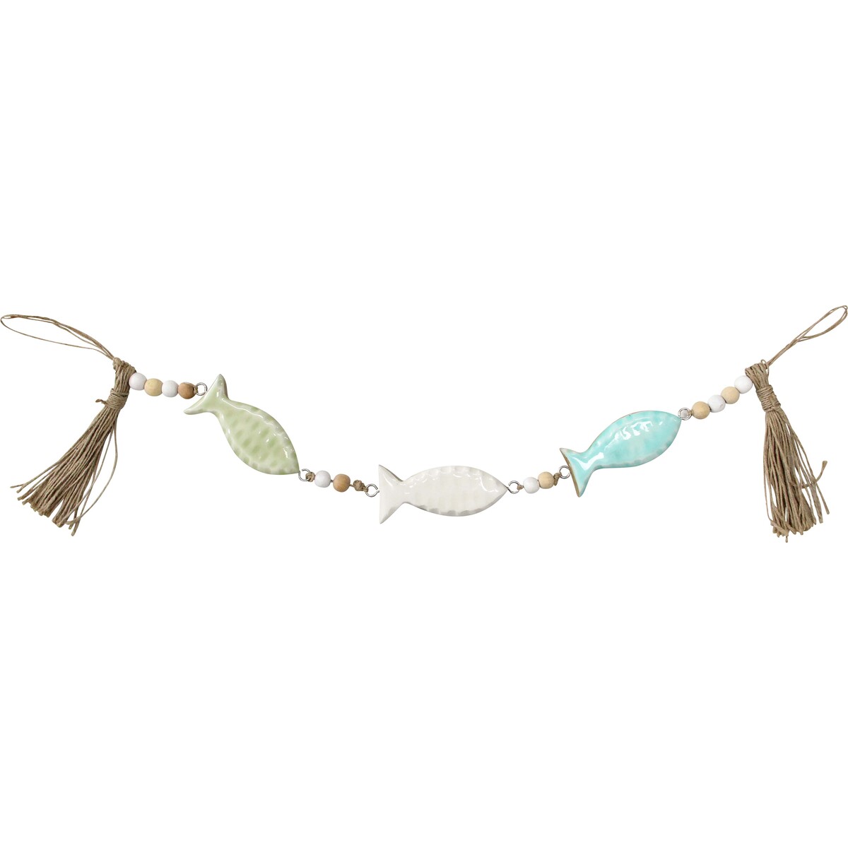 It’s handmade and finished from real wood, strung together with little beads and three unique fish figures in the centre. The ends are finished off with rustic twine tassels, giving the entire piece a chic yet relaxed touch that fits into a wide range of aesthetics. It’s a handy 4.5x1.5x70cm, so can be hung anywhere from entryways to above doors and windows too.