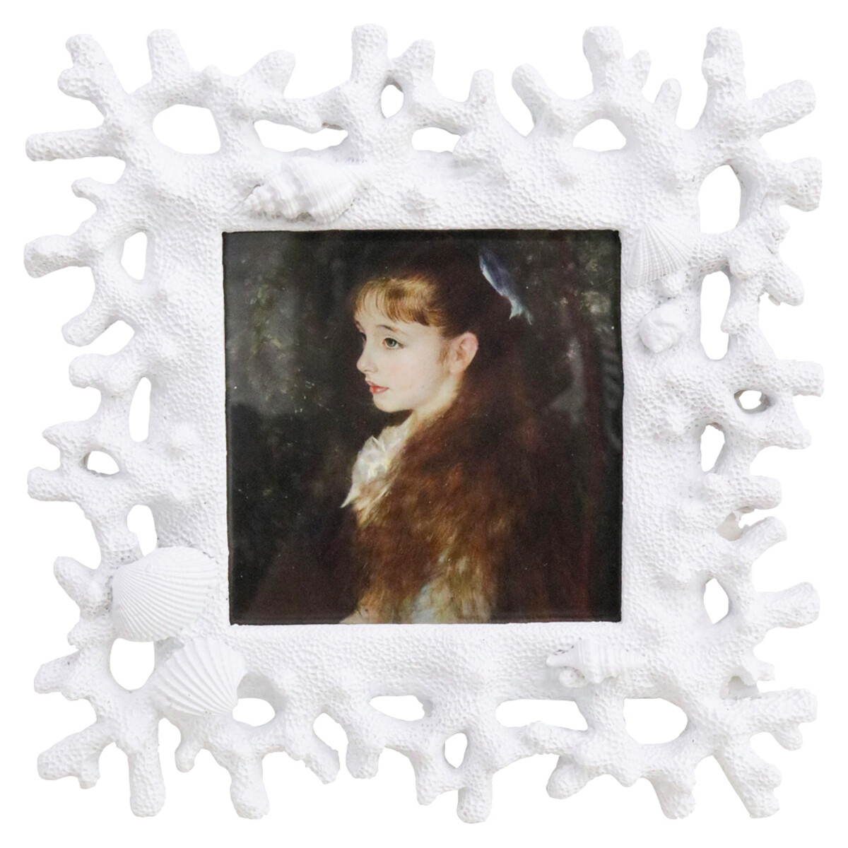 It features a textured resin border covered in intricate coral patterns and shells painted in crisp white. The design looks great against walls or shelves of any colour, especially those in cool or nautical shades.