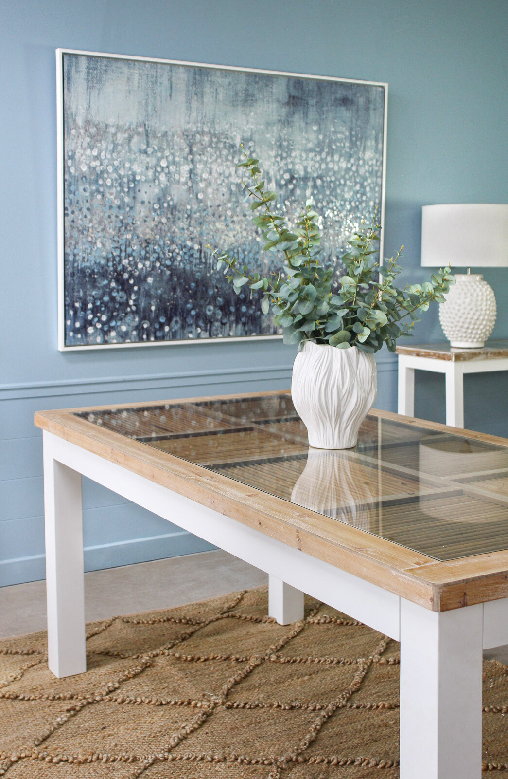 This piece really is something you could see displayed in so many different spaces. The calming vibe of a rain-covered evening is perfectly translated through the unique pattern of blues, whites and silvers - whether you’re styling up modern or contemporary spaces alike.