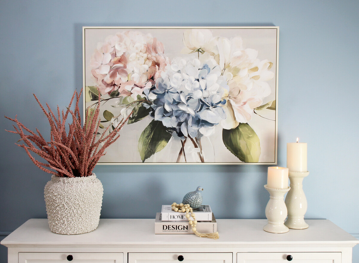 This framed canvas is the ideal size for above a bed or console at 100x70cm. The touch of tactile paint and plastic elements stand out and draw attention. The base of this artwork features soft pinks and blues to mimic the various shades you see in hydrangeas and will add depth to any interior. This piece is best suited in traditional homes but could work for modern ones too - it all depends on how you style it!