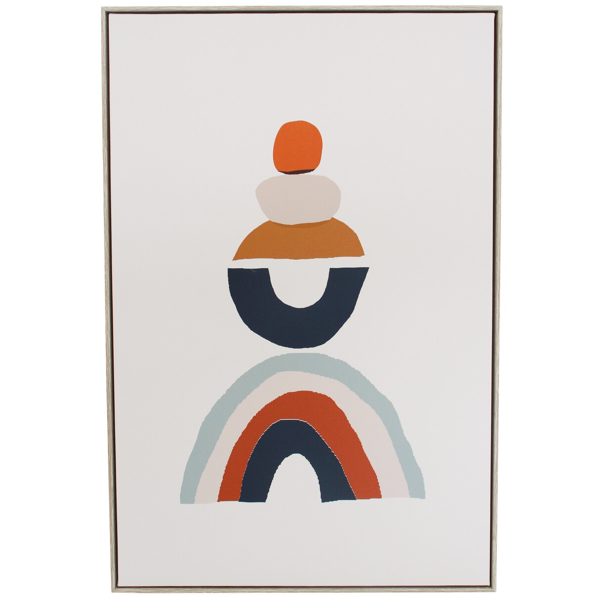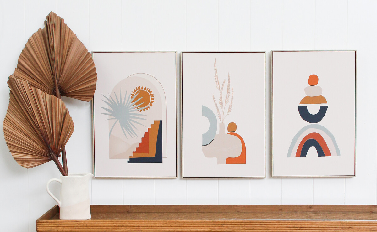 The Framed Canvas Modern 1 artwork is one of our true favourites for homewares and giftware retailers searching for something contemporary that will work almost anywhere. It’s fresh, it’s fun, and its stacked forms and playful arch have a way of grabbing your attention without being loud or distracting. There’s something really great about the combination of navy, terracotta orange, pale blue-grey, and white that works so well here. Feels gender-neutral but still very warm. The vertical layout gives this piece a sense of height as well - it’s perfect for smaller rooms or areas with low ceilings that need a bit more ‘lift’. We’ve also seen it work beautifully in offices where you want some personality but nothing over the top. Think hallways, entryways, small offices - there are so many places where Framed Canvas Modern 1 can shine. Measuring 40x60cm on quality canvas and solid pine frame, this is a piece your customers will actually want to come back for - there’s always more than one spot in the home for something like this. And at this price point and size? It’s going to be popular with every demographic.