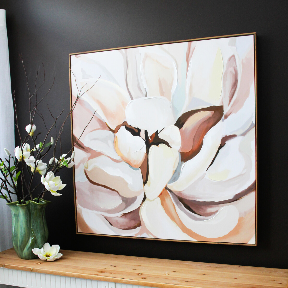 Every piece is just a bit different because of the hand finishing, and that's part of what makes it so special for us. The mix of canvas, acrylics, and resin means there's this cool play between gloss and matte – we like that little surprise you get up close. While we always love pieces with pops of colour for shop displays, this one feels classic but contemporary – it's modern florals done right.