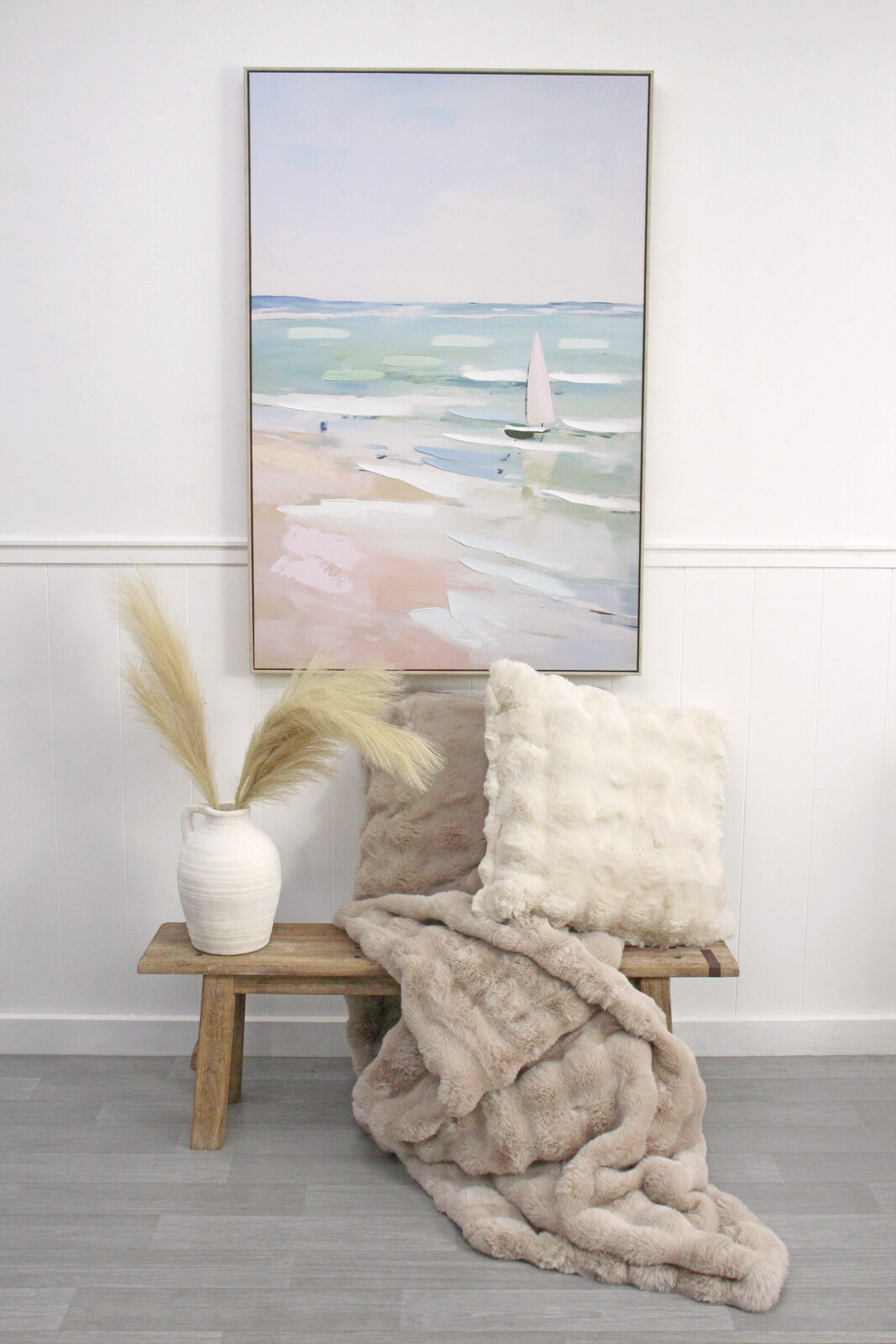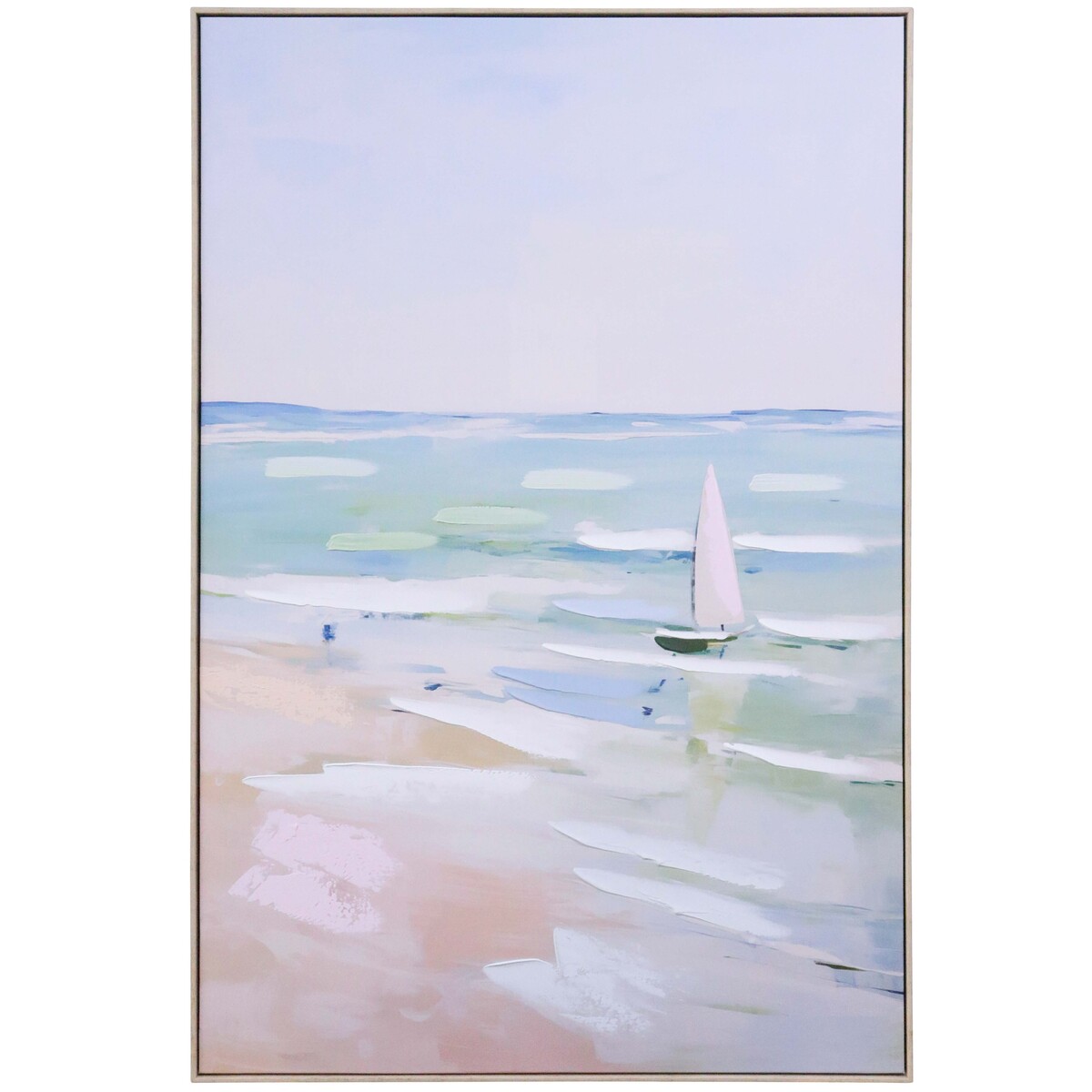 Framed Canvas Set Sail is such a breath of fresh air for any homewares collection - we keep coming back to that. The coastal breeze really seems to come through in every soft blue, pale green and sandy pastel stroke on the canvas. These 80x120cm pieces are something else up close. Hand-finished with unique paint or gel touches, no two canvases are exactly alike. That’s just the nature of individually crafted art. There’s a subtle sense of movement and texture thanks to those hand-finishing details. We find this really sets them apart from typical prints - it feels personal, almost meditative - customers have told us that. From contemporary minimal interiors, to spaces that are more classic or eclectic, there’s an easy-going feel that won’t throw off any existing colour palette. PS frame, pine wood and textured canvas all come together in this light-hearted landscape. Whether displayed alone or grouped, these work brilliantly in lounges and hallways but also in offices or anywhere people need a gentle nudge to unwind.