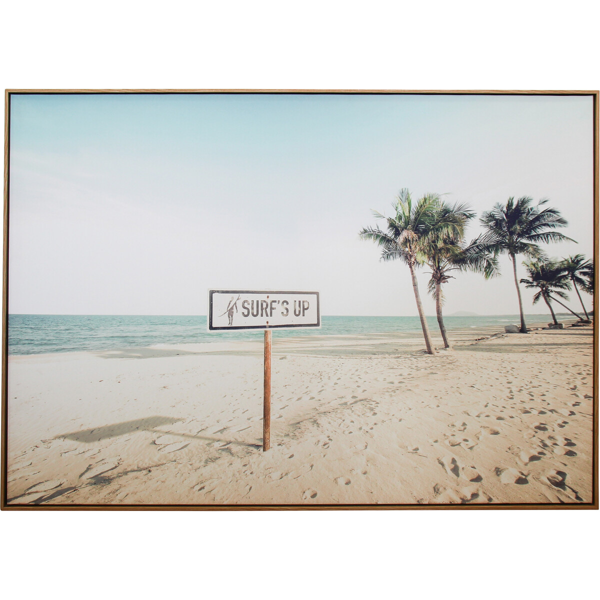 This is our Framed Canvas Surfs Up, measuring 72x102cm and made from canvas, resin, and pine - a piece that pretty much demands attention. We always say it’s the artwork we wish we could hang in every holiday home. It catches something so fun and free spirited about the beach, but is also quite easy to fit into a range of spaces at home or even an office. You’ve got this sandy shoreline - genuinely, the photo is almost tactile when seen in person - with the timber pole sign dead centre and bold against pastel blue water. It’s a vintage-inspired print that channels that little bit of wanderlust in all of us.
