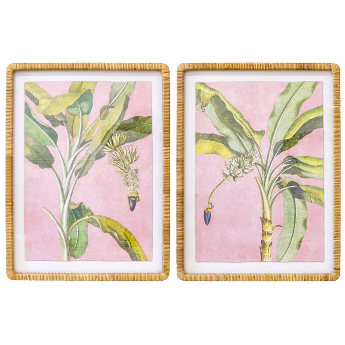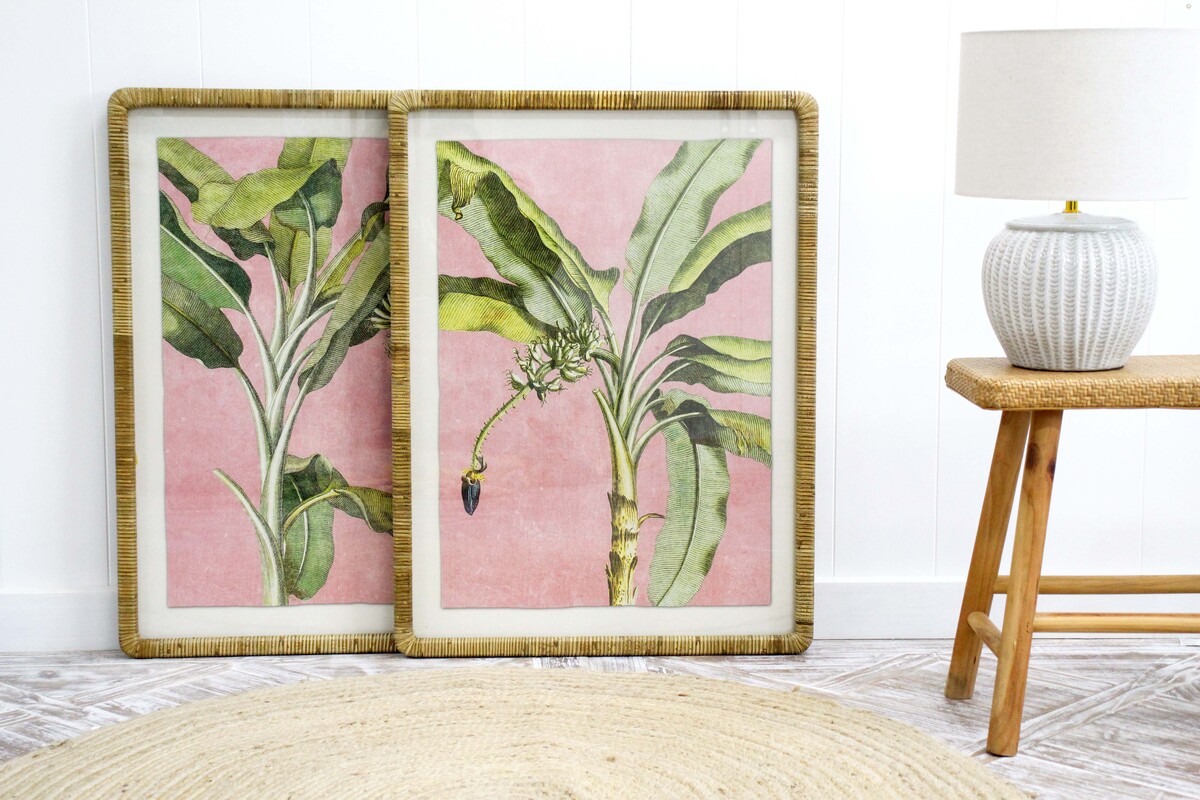 Each piece is generously sized at 60 x 80cm. So they’ve got real presence without swallowing up the wall. The thing that stands out for us, though, is the soft vintage pink backdrop and detailed banana palm illustration. It’s not loud or garish - just a pop of colour and vintage inspiration for interiors that want warmth and texture but with subtlety.