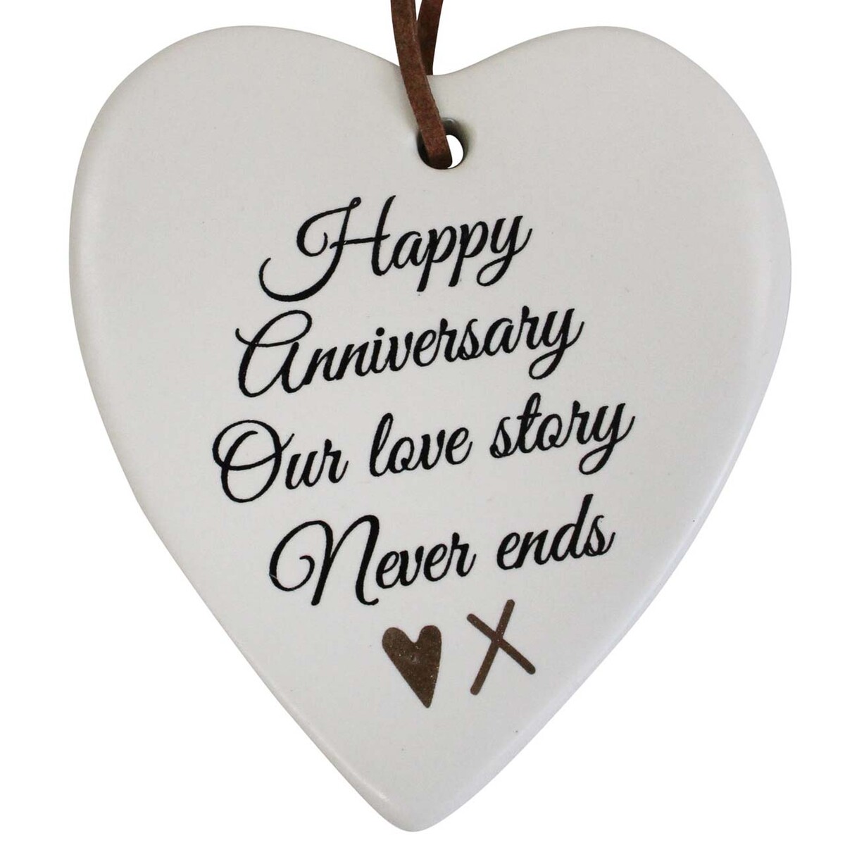Our Hang Heart Anniversary ceramic ornament has proven to be a sweet little best-seller for us, and it’s not hard to see why. We’ve had a great time watching how shops around Australia have styled this one in their window displays, usually paired with dried or faux florals and whitewashed timber on open shelves - but it’s also a versatile giftware accent piece that brings heart and sweetness to any homewares collection display. It’s a unique find at 8x9cm plus hanger, made from creamy white handcrafted ceramic with leather string - the gentle ‘imperfections’ you’ll see in the ceramic and printing come from the hand-finished process, giving each piece a lovely and individual touch. The soft black script is easy to style with other vintage, Scandi, shabby chic, French farmhouse or cottagecore lines too. The message is really what makes this one though - it simply says Happy Anniversary Our Love Story Never Ends with a little hand-drawn heart and kiss.