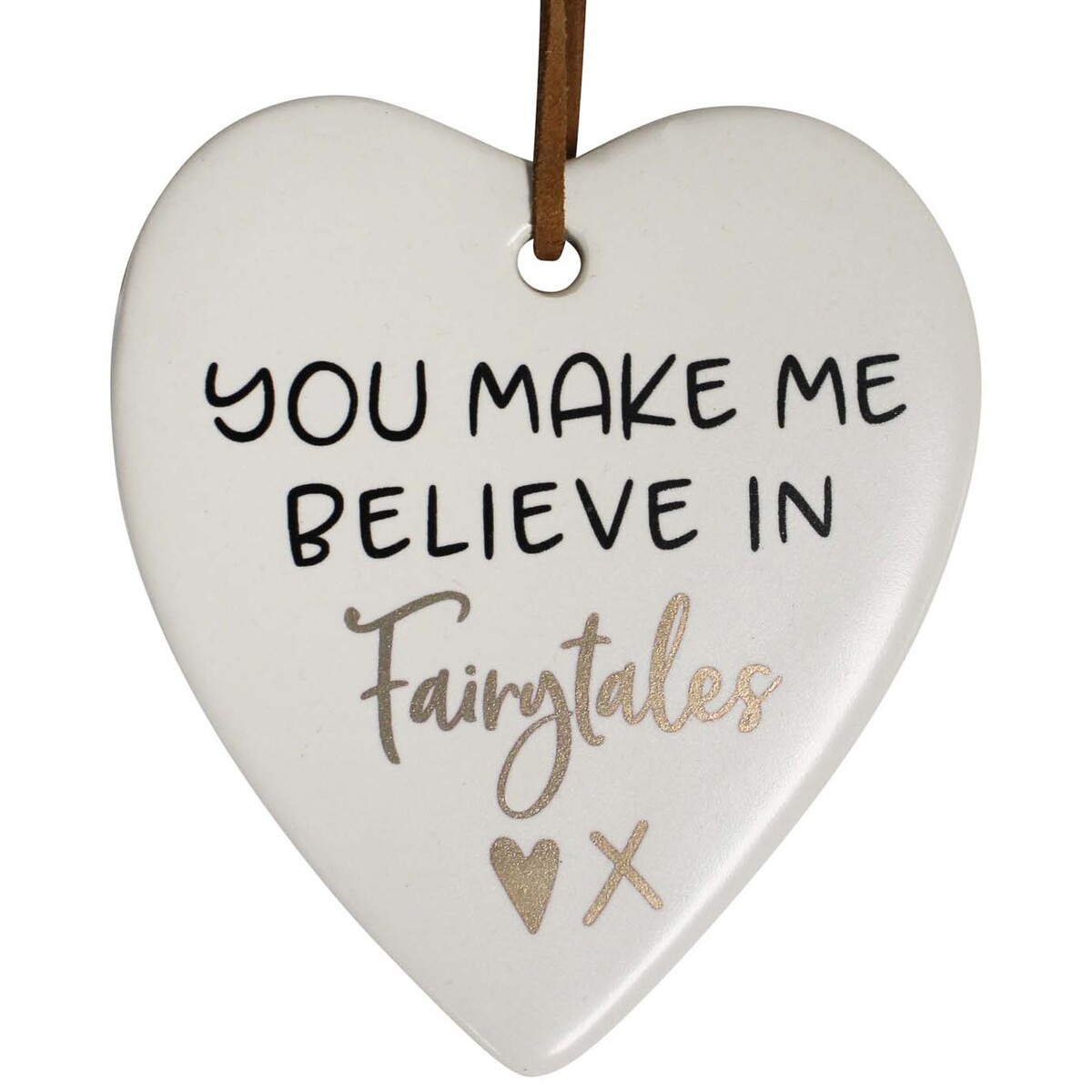 The message, "You make me believe in fairytales," written in bold, black font with a metallic gold accent, speaks of magic and whimsy. It could work for partners but also for friends, children and anyone else you wish to express gratitude for.