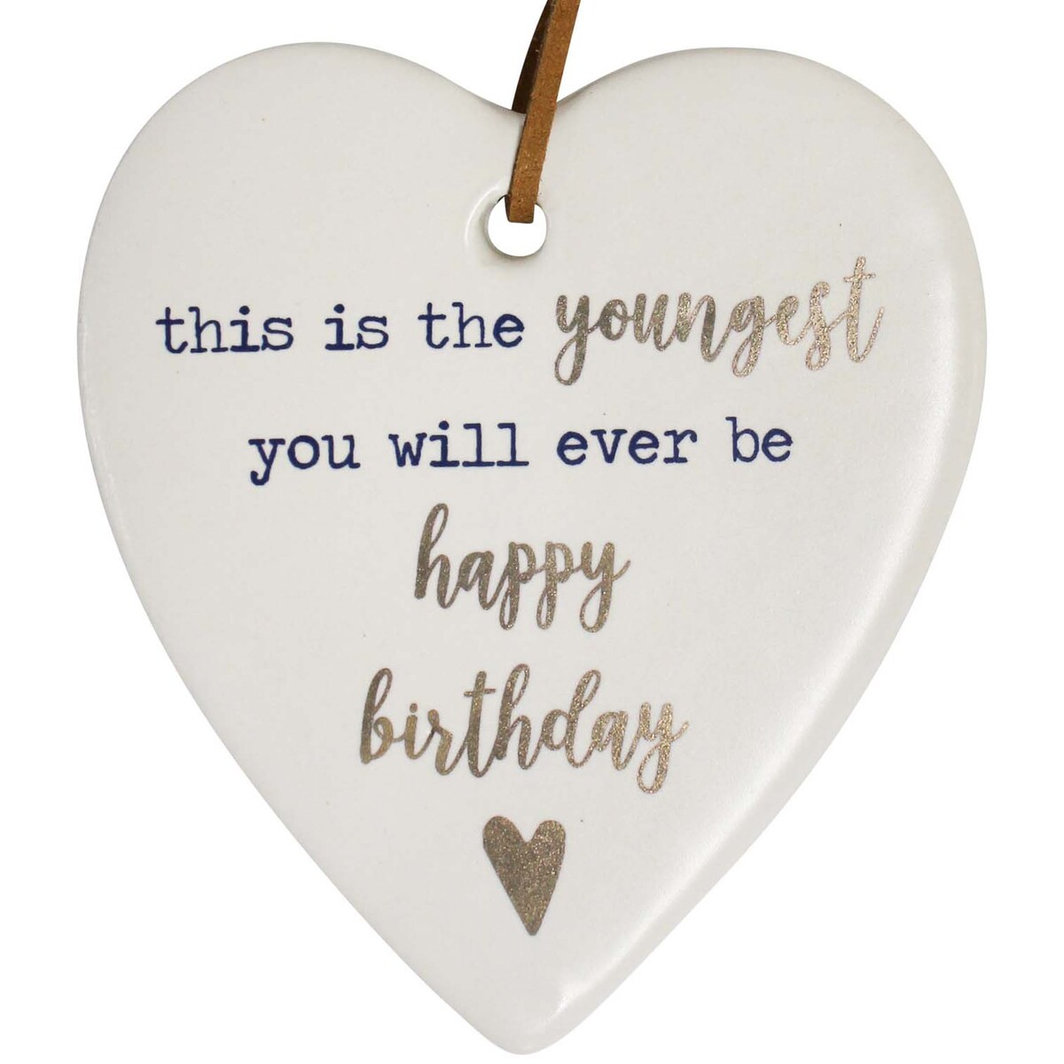 A charming and thoughtful gift, the Hang Heart Youngest Birthday makes a sweet addition to any homeware or giftware selection. With its simple and sweet message, ‘this is the youngest you will ever be - happy birthday’, customers are bound to be delighted with this little plaque.