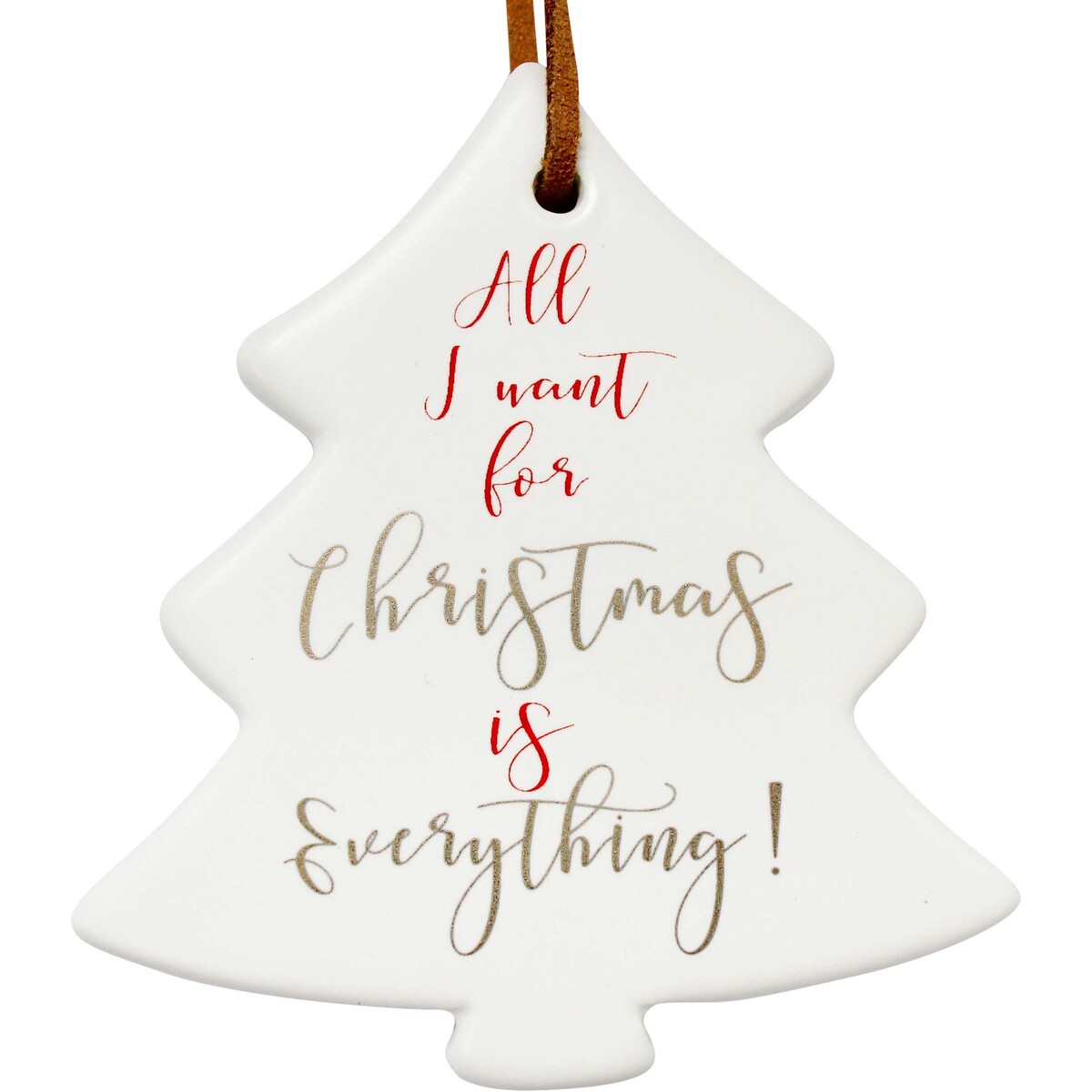 The phrase - All I want for Christmas is Everything! - is an instant hit. We get laughs every time someone picks it up. The print is very neat with red and gold script, and although each one’s just a little different, they all seem right at home among both country cottage Christmas styles or modern Scandinavian-themed festive decor.