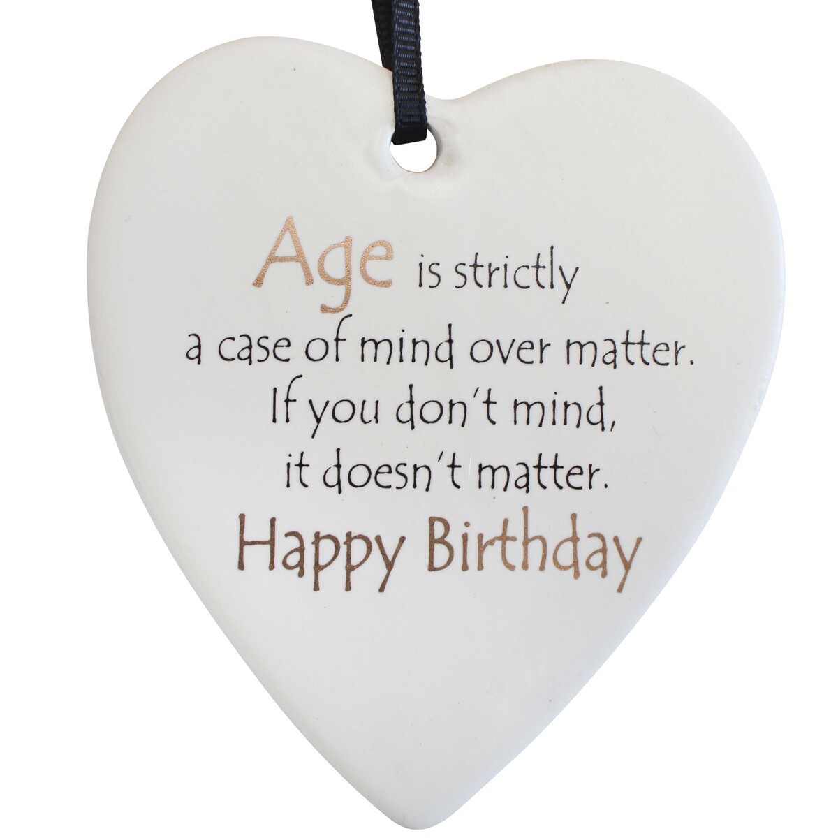 Hanging Heart Age Birthday - a heartwarming birthday gift for those celebrating another trip around the sun. Our 8x9cm ceramic heart comes with a hanger and features a sweet message to share on their special day. It is designed in a neutral colour that fits various home aesthetics, whether hung up on walls, doors or shelves.