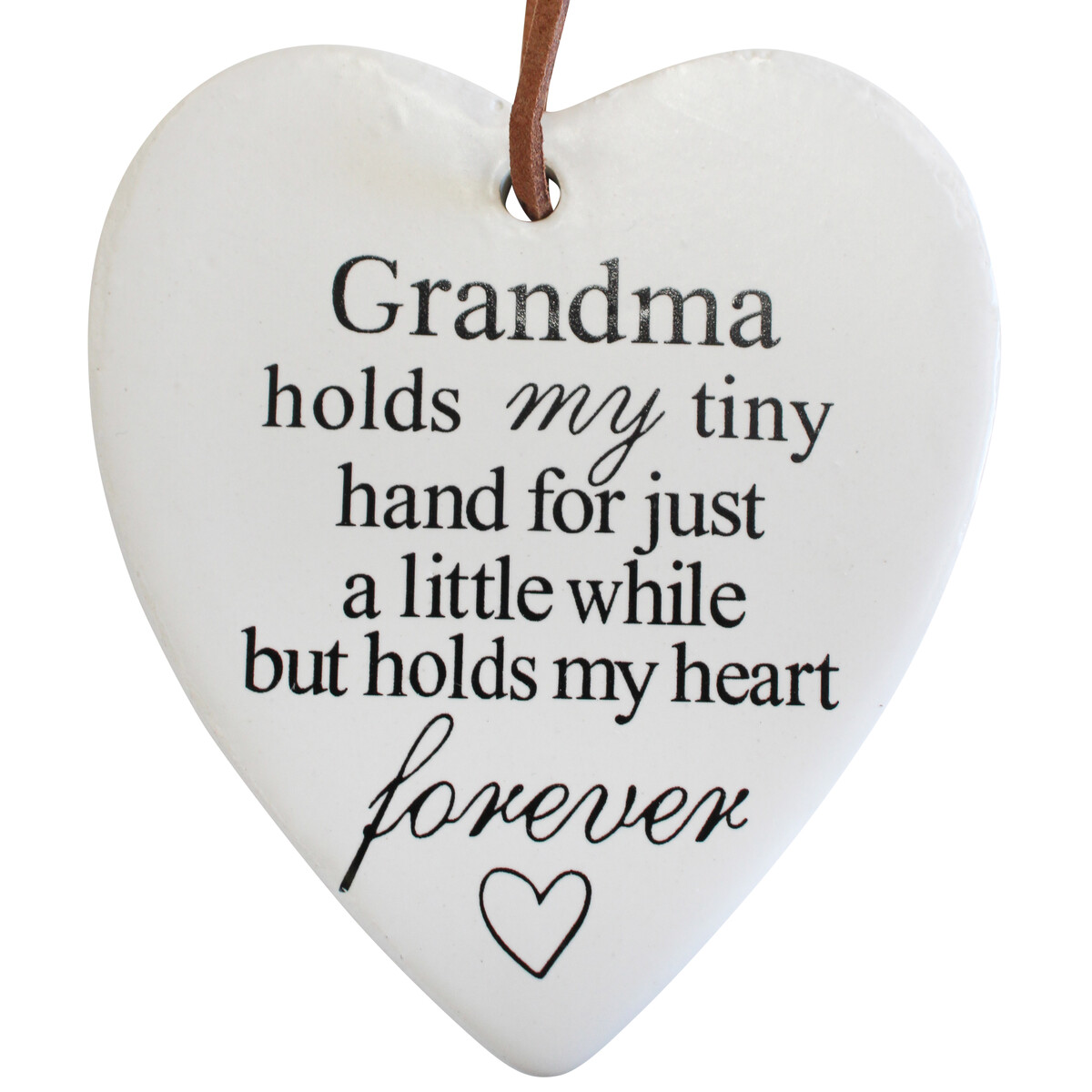 We absolutely love this sentimental Hanging Heart Grandma Holds ornament and we’re confident it’ll be a big hit with your customers too. Crafted from white ceramic, it’s heartfelt message captures the special bond between grandma and grandchild: “Grandma holds my tiny hand for just a little while but holds my heart forever”. At 8x9cm, it’s the perfect little gift for a grandchild to give or just a simple way to add sentimental value to grandma’s home. It has a lovely glossy finish and we adore the text design too. It can blend in with both traditional, contemporary, and modern decor. The brown hanger loop lends some rustic style, but you can swap it out if you want to match other colour palettes. These types of simple yet meaningful ornaments are always such great sellers - especially around holidays. Like Mother’s Day, Christmas, Grandparent’s Day etc - maybe Father’s Day too?