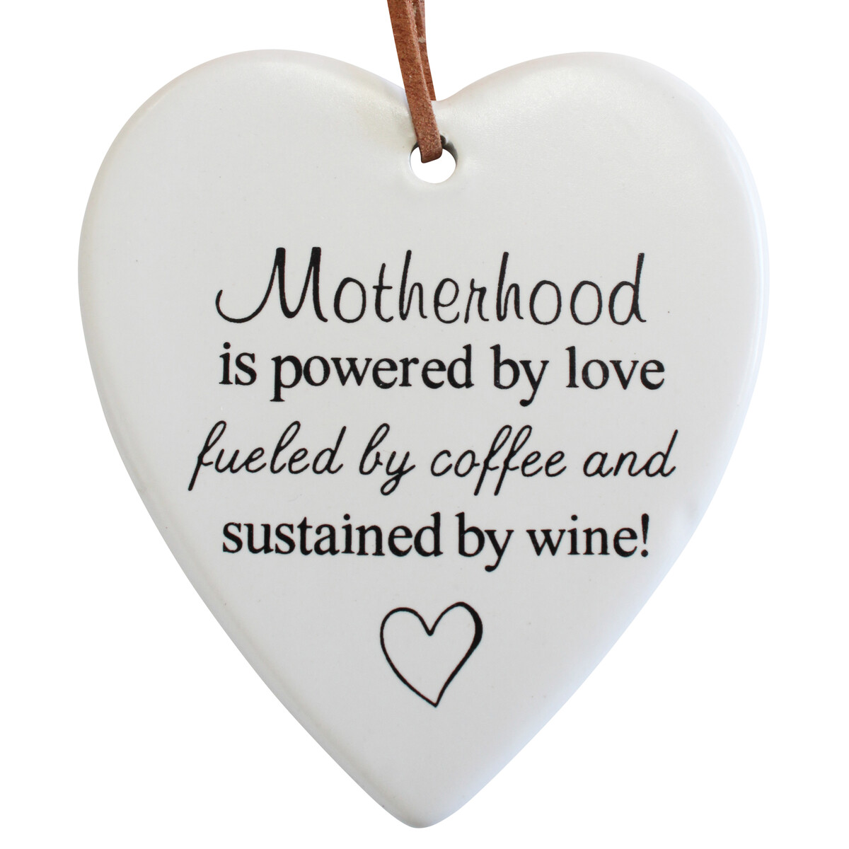 This Hanging Heart Motherhood sign is a charming little piece that celebrates the wonderful chaos of motherhood - and does it with a laugh. It measures 8x9cm (plus a handy hanger), and is made from ceramic in a crisp white, with an easy-to-read black font. A fantastic gift idea for new mums or anyone who could use a reminder that love, coffee, and maybe just a splash of wine is sometimes all it takes to get through the day!