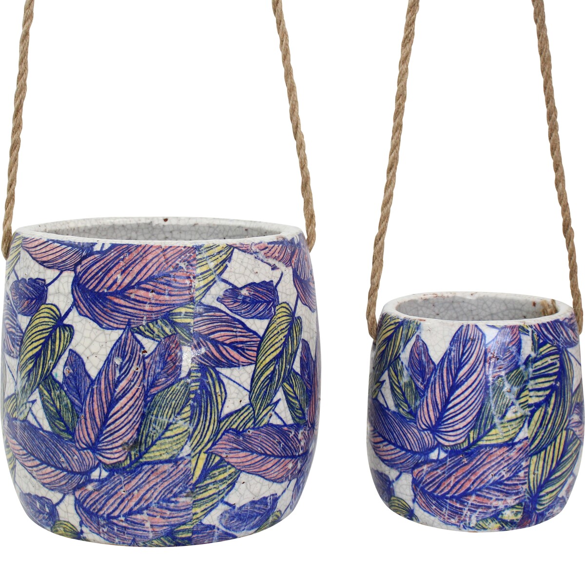 We are loving the hanging pot trend right now, and this set has just hit the mark for us - beautifully hand-crafted terracotta pots with a textured crackle glaze and a design that pops with colour. Our Hanging Pot Set of 2 Flora is a fun, versatile way to style plants indoors or out, and it is hard to believe they work just as well on their own or in multiples for a really dramatic feature. They are surprisingly light, even in the larger 18x18x17cm size (the smaller one is 13x13x12.5cm - a great mix), and the strong natural jute hangers give them a tactile touch that is just missing in glass or metal hangers. The vivid blue, pink, and yellow leaf motif has that lush botanical look our customers keep asking for. Each piece does have its own unique crackle finish – which we actually love – because it makes every single piece feel handmade. What’s interesting about this set is how it manages to bring on-trend brights to any space without clashing against classic decor. This set has quickly become one of our favourite go-tos for contemporary tropical looks.