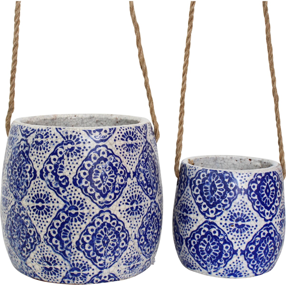 We find these hanging pots have got this really striking design that grabs attention but still works with a lot of different spaces. This set comes in two sizes - 18x18x17cm and 13x13x12.5cm - with strong jute hangers, making them a great addition for homewares or plant shops looking to offer something just a bit unique. The crisp blue-and-white patterns feel inspired by Italian tiles or a bit of a coastal look, but without being too themed, so they're honestly quite versatile. That crackle finish adds plenty of character - we actually think those little imperfections are what make each one feel special. So we've made it clear: they're not faults, just part of how each pot is one-of-a-kind.
