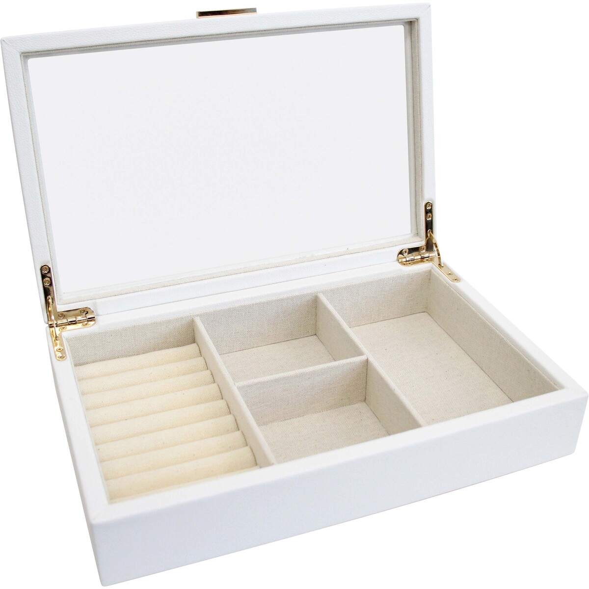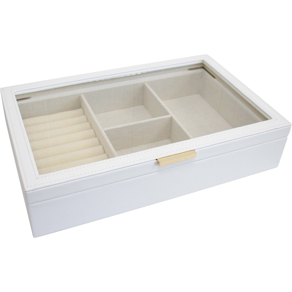 Let’s be real, there’s a heap of jewellery organisers on the market - but we honestly think our Jewellery Box Large in White is something just a bit special. For retailers with customers who love order or are after an easy gifting option, this organiser will tick a lot of boxes. It measures 29.5x19x7cm, so it’s got serious storage space without being hard to find a place for at home. The clever MDF construction keeps it feeling sturdy but lightweight, and it’s covered in PU for that sleek look. Simple enough to go with minimalist décor, but plenty of pretty detail to suit someone who likes a bit more polish. Inside you’ll find linen lining to keep everything protected and four varied compartments - so there’s room for rings, earrings, bracelets and even those slightly awkward statement pieces. And yes, we know the glass lid means this is also prime display real estate for special items too!