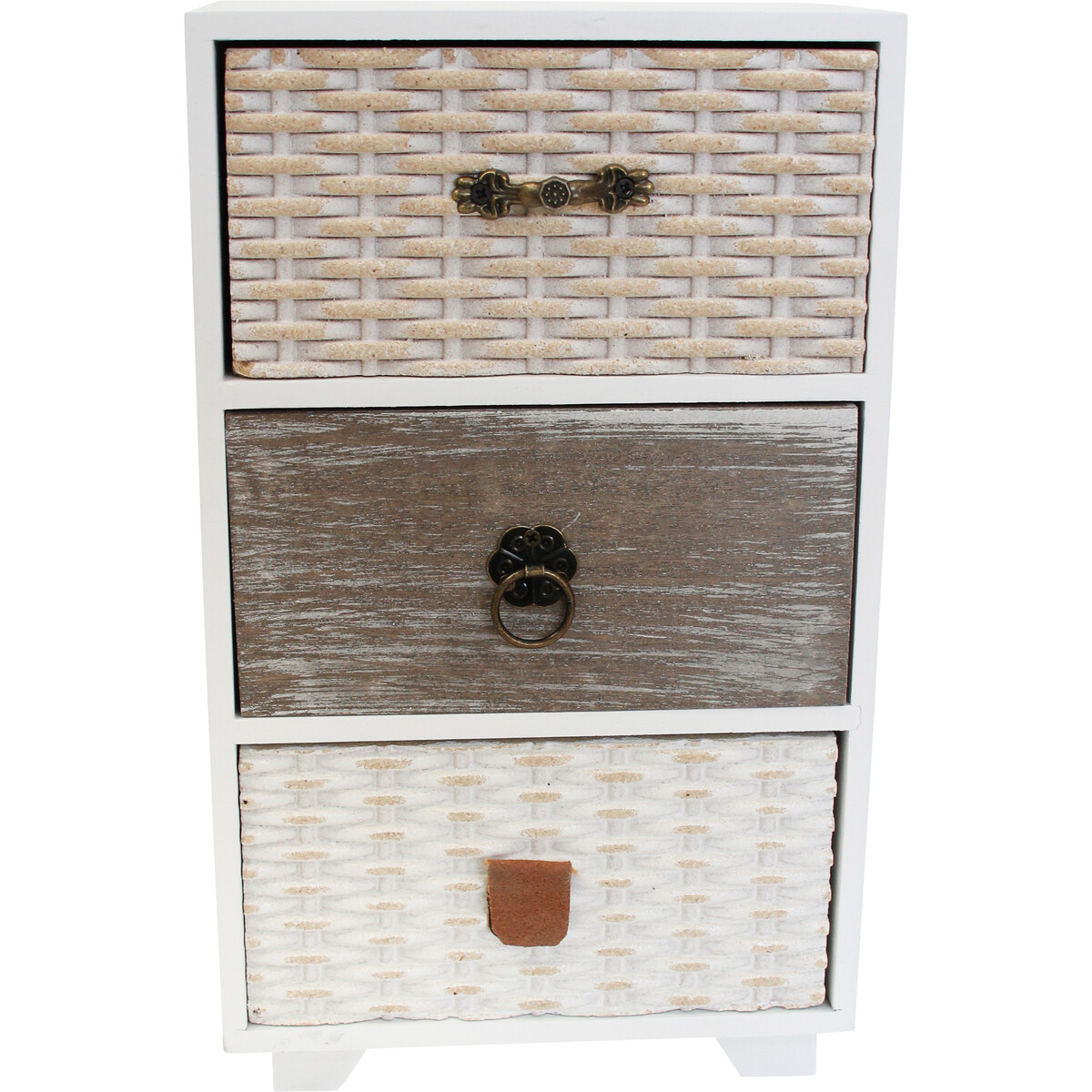 This is one of those pieces where the more time you spend looking at it, the more you notice - all those little details give it that warm, unique personality. It has a classic white frame but with three drawers that each have their own design - two in a woven look, and one with a kind of brushed wood grain finish, with three different types of handles. It is extremely versatile and its subtle, classic look will sit well in any space and with pretty much any interior style - contemporary, traditional or even rustic or country style rooms.