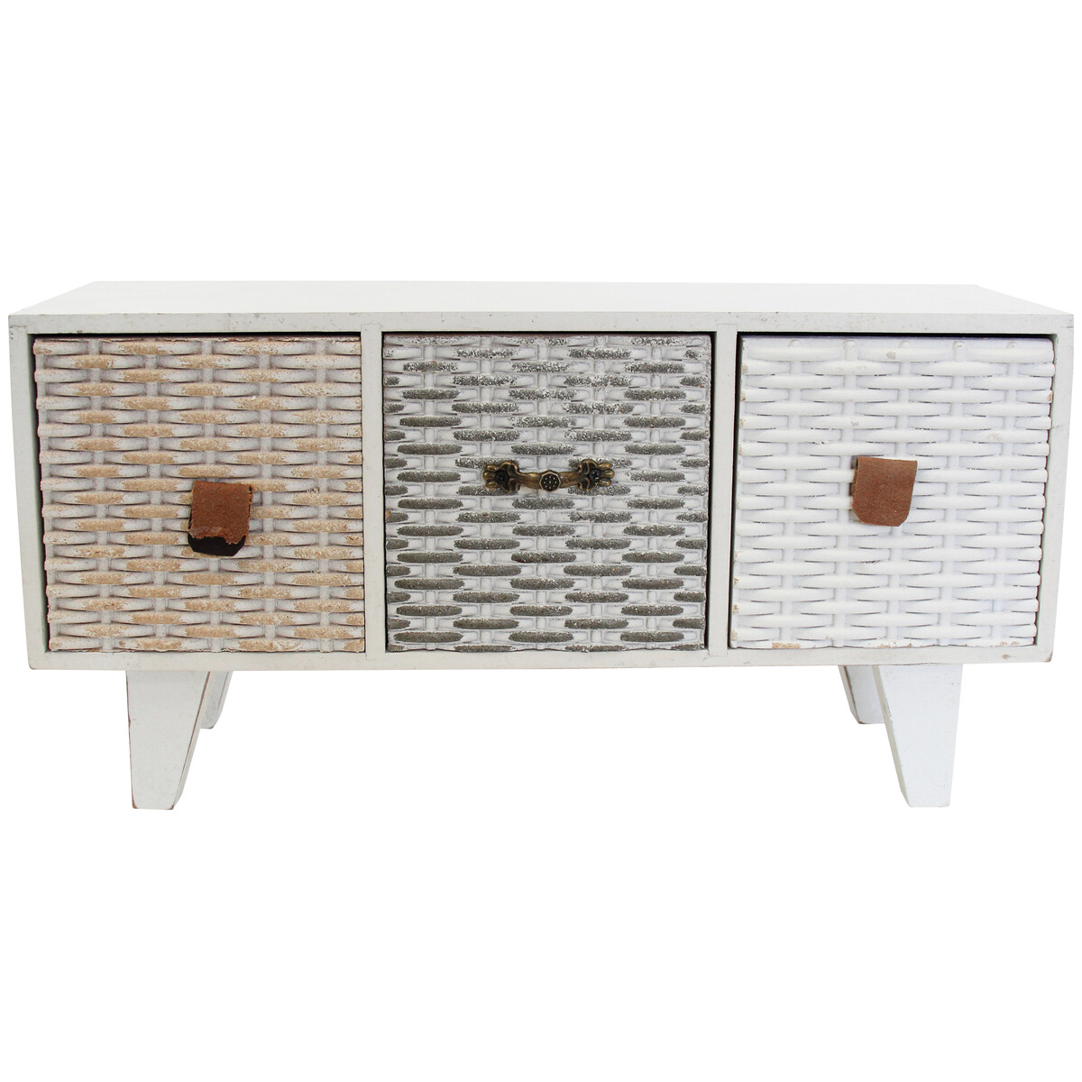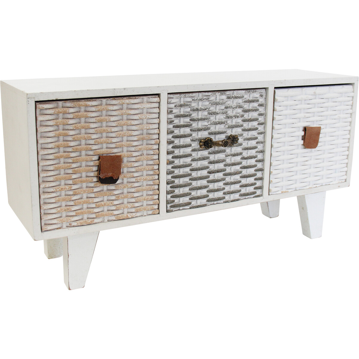 We're pretty excited about our Esma 4 jewellery drawers. They've got a cool retro look with their basket weave fronts, distressed painted finish, and those sturdy little legs - not your average storage piece. They're compact at 33x17x10cm, made from durable MDF, and offer a stylish way for customers to organise their favourite pieces. This one's perfect for anyone wanting something with character that fits on top of a dresser or makes a feature on a shelf.