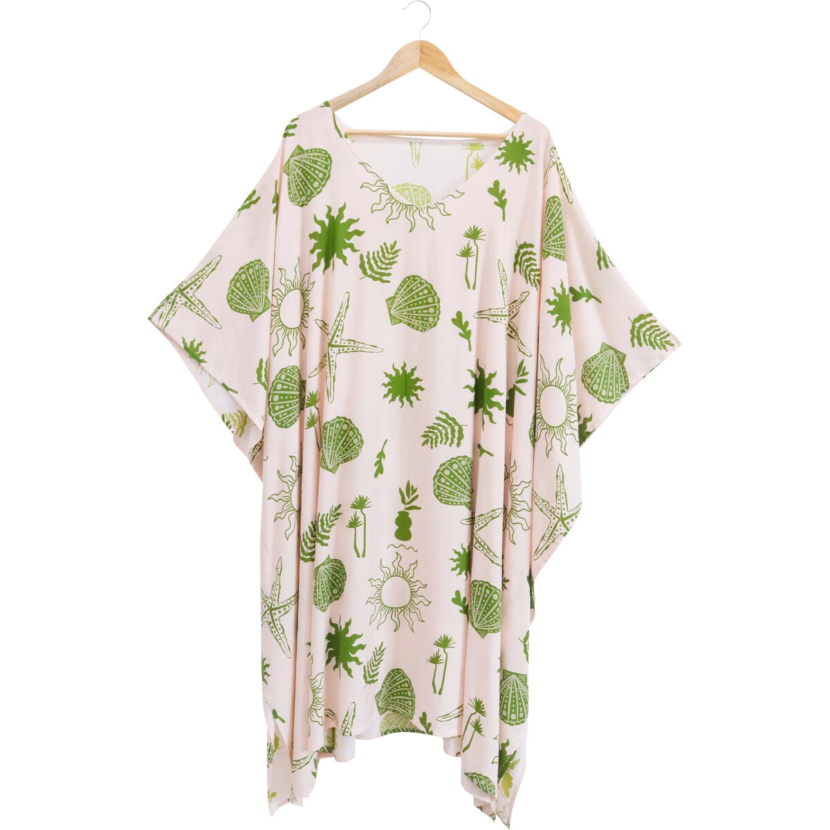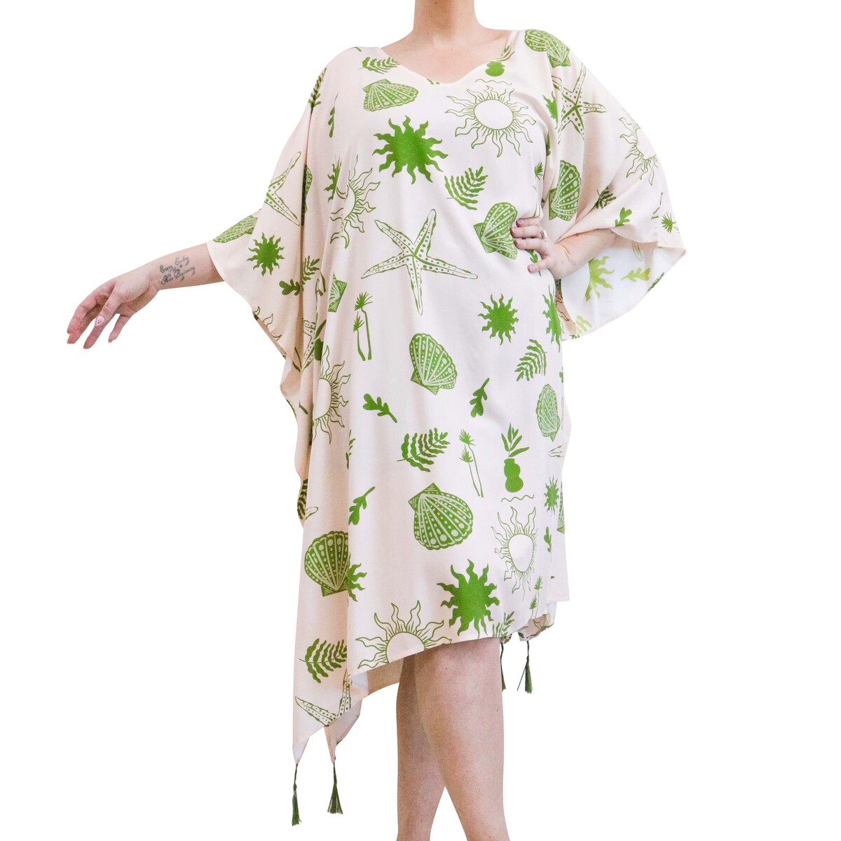 Kaftan Vacation: Large Imitation Silk Kaftan With A Botanical And Shell Pattern We might be biased, but kaftans are the most versatile piece you could possibly have in a wardrobe. This one’s a one size fits most at 120 x 120cm, and made from soft imitation silk - it feels just like the real thing but it’ll hold up for ages (and it’s way easier to look after). We love how this gorgeous botanical pattern in fresh green pops on the cream base, evoking daydreams of summer holidays by the beach. This kaftan is definitely more than a cover-up. It can take you from sleepwear and loungewear through to accessorising for going out and breezy holiday days with friends and family. And it doesn’t hurt that they’re still trending really hard at the moment. It’s suitable as a staple in literally any wardrobe for year-round wear, whether indoors or outdoors, and we reckon you’ll have people coming back for these ones. Our model is 176cm tall & wears size 12 - fit may vary depending on body type, style, and how the garment drapes.