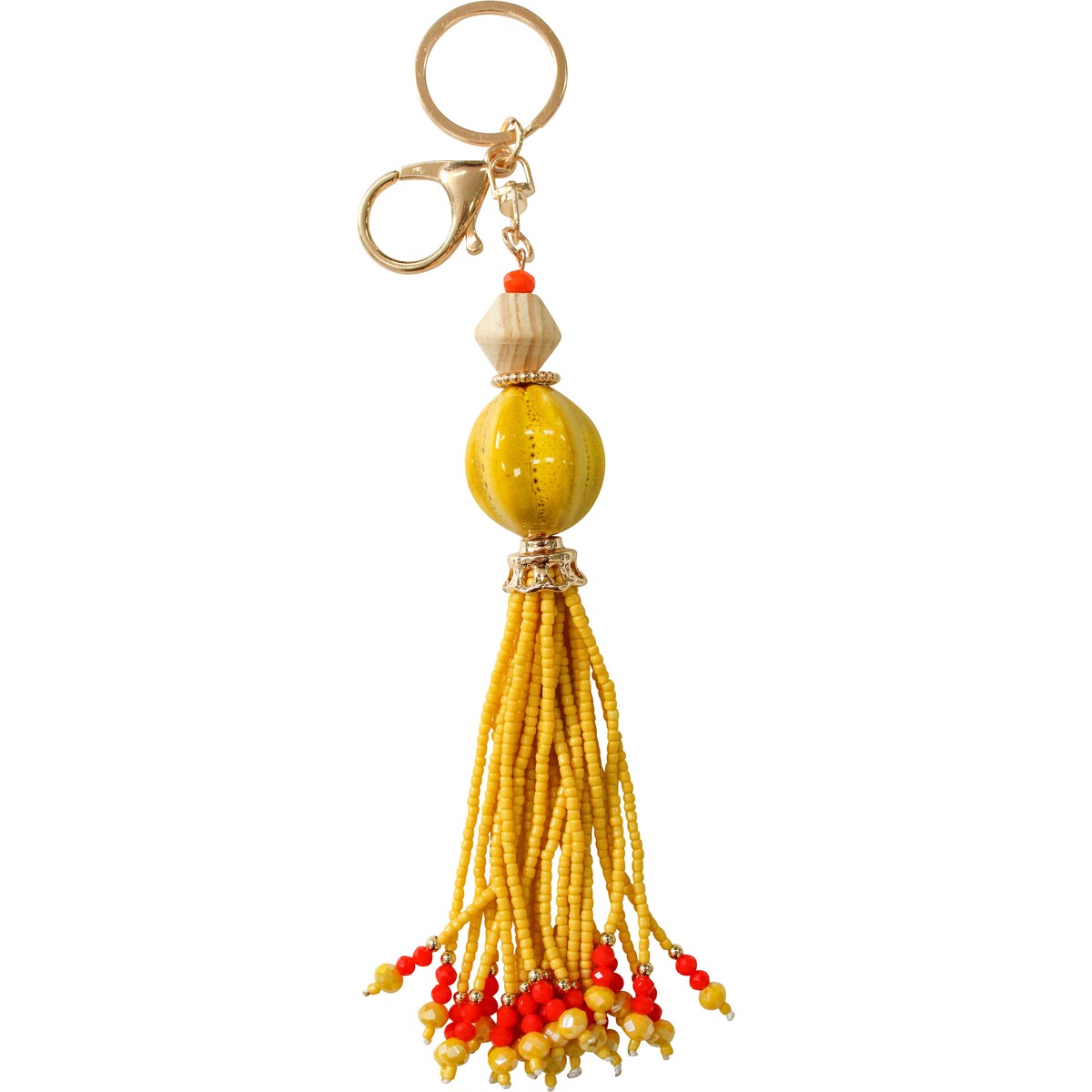 This is one of those pieces we like to keep around, the ones that make you want to click your heels every time you see it hanging on your bag, wallet, or even keys. The vibrant yellow and orange shades are stunning and perfect for the summer months. It’s got a festive charm that is sure to draw customers in. With its brilliant bright yellow and white wooden beads adorned with bright yellow and orange crystal seed beads, this keyring/ bag hanger is fun, quirky, and charming - all at once. We’re big fans of the long beaded tassels that hang beautifully from the larger bead at the top, it adds a lovely charm to any accessory it’s attached to. It’s got an easy clip-on mechanism and sits at just under 20 cm, making it compact enough to use anywhere and everywhere!