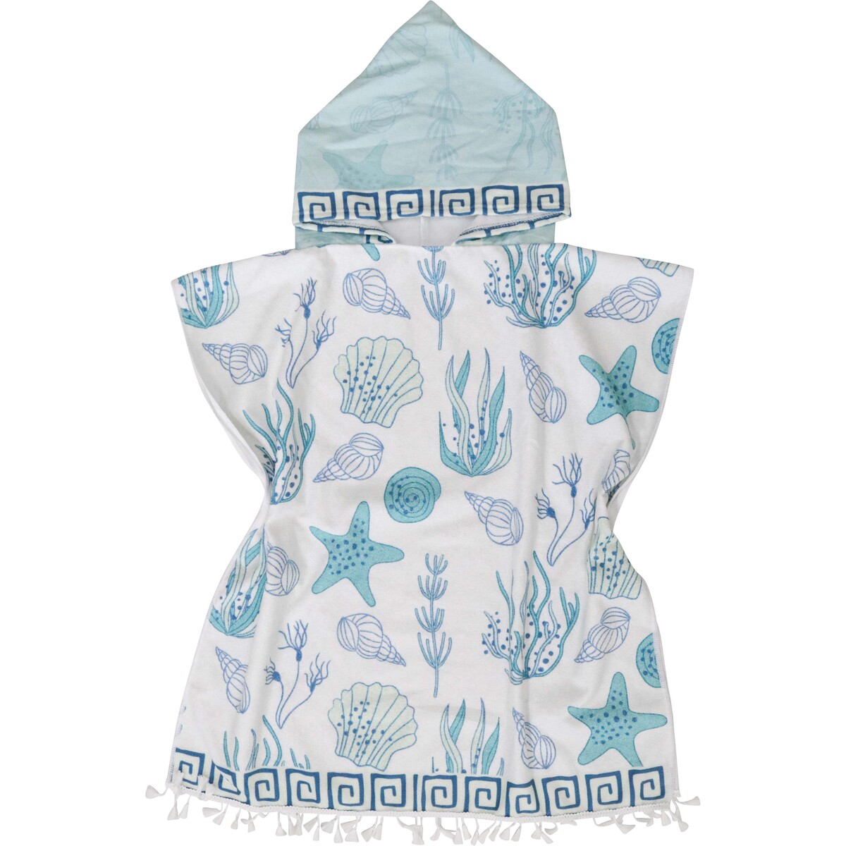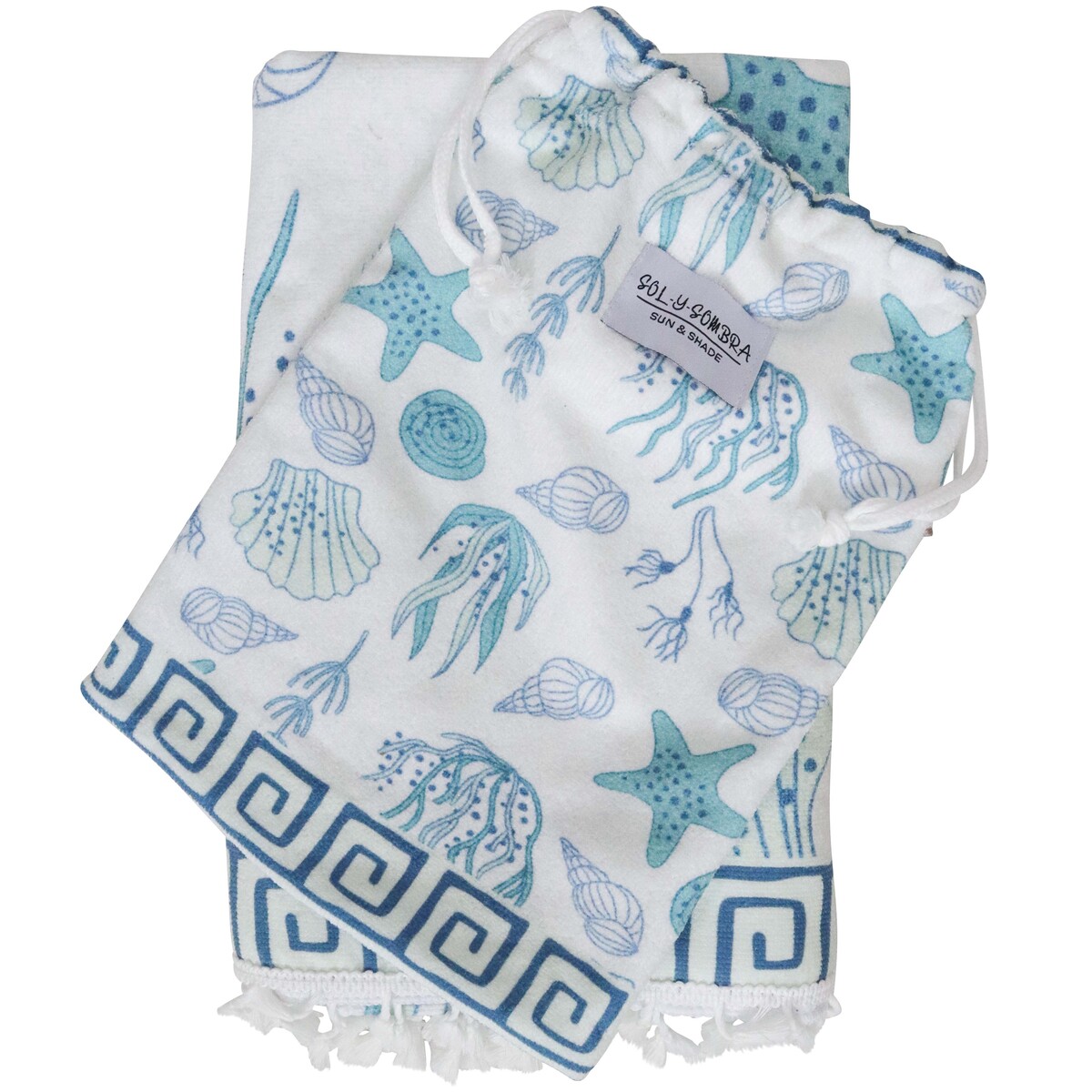 We're always on the hunt for something fun, practical, and just a little bit clever - that's why we've fallen pretty hard for this Kids Towel Poncho with matching Drawstring Bag in Ocean print. It's done in this fresh blue and white microfibre that’s beachy without being over-the-top, and we think kids will love those cute sea creatures scattered everywhere. The Greek key border? That unexpected detail keeps things looking pretty smart - not too childish, but definitely playful. The size is generous: 70 by 70 centimetres plus the hood, so it’s roomy for most ages.